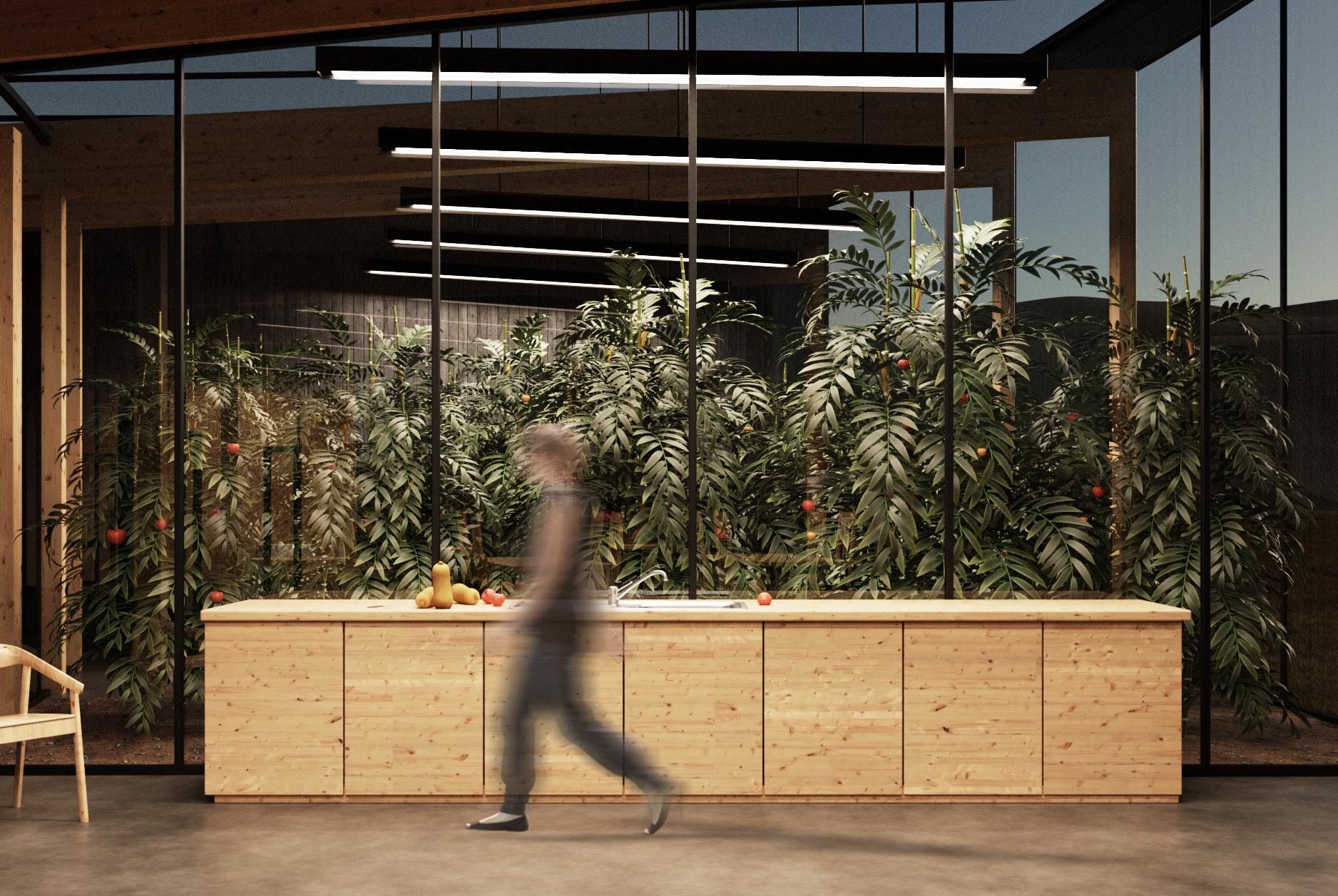 The building itself, which is based on a circle plan, is intended to enhance a feeling of safety and cosiness in this beautiful but also wild and virgin landscape. Simultaneously by having big windows in community spaces it blends the border between inside and outside, to avoid a perception of detachment from the surrounding nature. The main structure consists of spaces such as a greenhouse, social rooms with a kitchen, showers with toilets for travellers, large storage spaces, an information point and a space to exhibit and exchange products with other members of the community.
