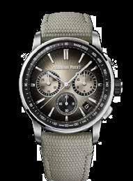 Light grey textured calfskin strap with titanium AP folding clasp and interchangeable strap system. Additional dark gray calfskin strap