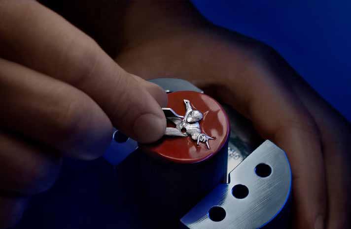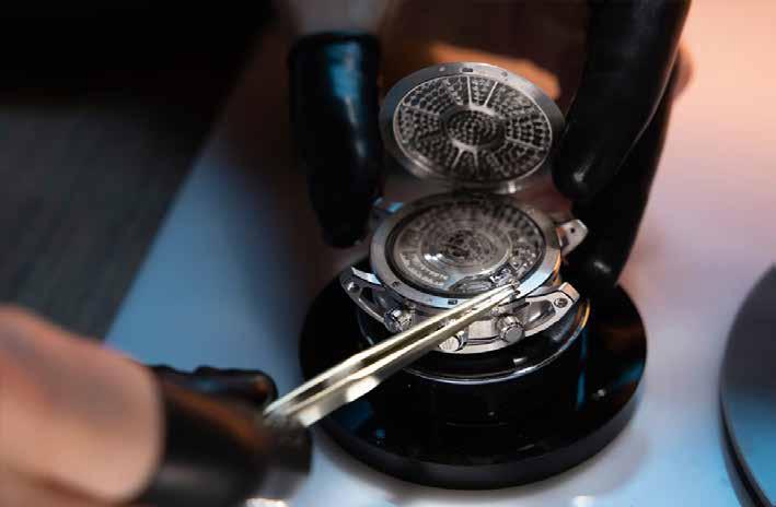 At the heart of this masterpiece lies a scintillating new dial finish, which brings Mayer's vision of a crystal sky to life. The embossed motif features irregular shapes reminiscent of crystals, their sharp angles and facets adding unparalleled depth and brilliance to the timepiece. Achieving this level of detail required cutting-edge craftsmanship, with the stamping die produced through electroforming, a complex process that builds the die atom by atom. This innovative approach underscores the brandâs commitment to combining artistry with technical mastery, resulting in a truly exceptional creation.