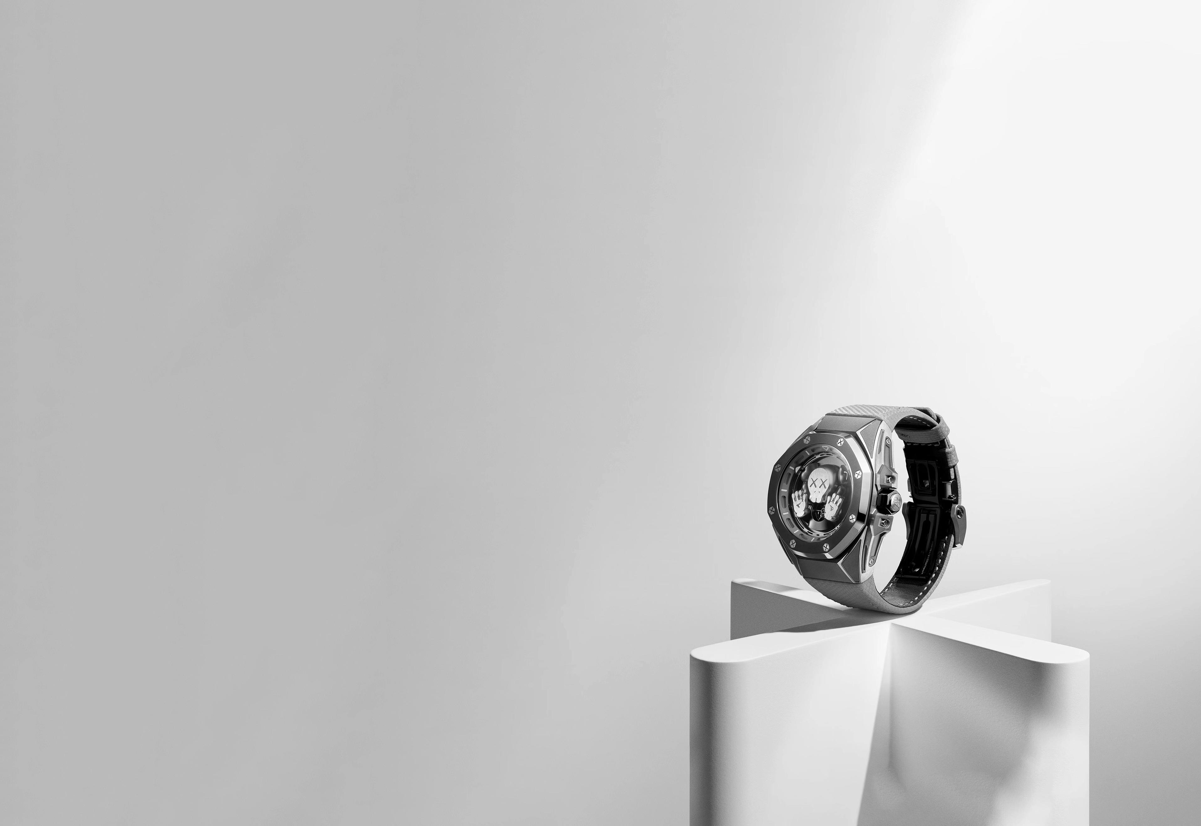 Designed in collaboration with KAWS, this limited edition is made entirely of titanium and has a miniature COMPANION at its heart. The peripheral time display offers an unobstructed view of this cartoon-like character in shades of grey.