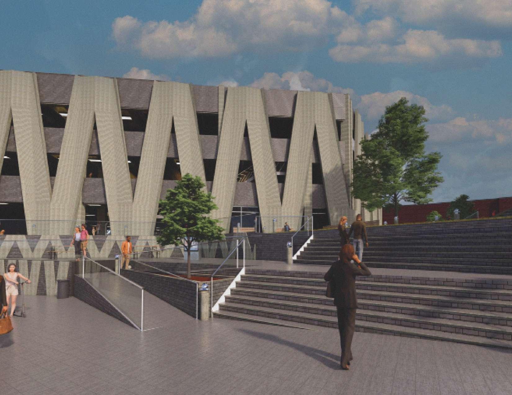 As a team, we were tasked with using a precast concrete panel system for the parking garage façade. Over the course of the semester, we developed several panel designs, each crafted in concrete. Ultimately, we chose a diagonal panel design, which we repeated to form the V shape that defines the façade. This approach allowed us to create a clean, impactful design while ensuring an efficient manufacturing process.