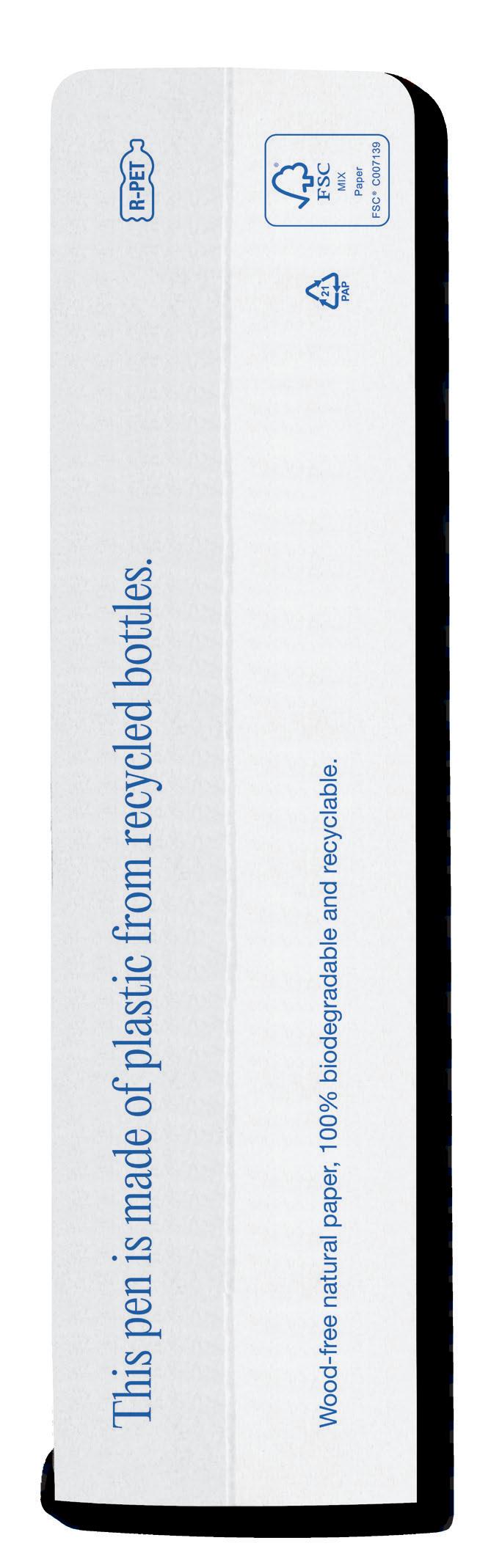 Kind is made not only of recycled materials but of recyclable ones too. To continue writing change even when the pen runs out, separate the plastic components from the metals and dispose of them in the relevant recycling bin. You can deposit the refill in the unsorted collection.