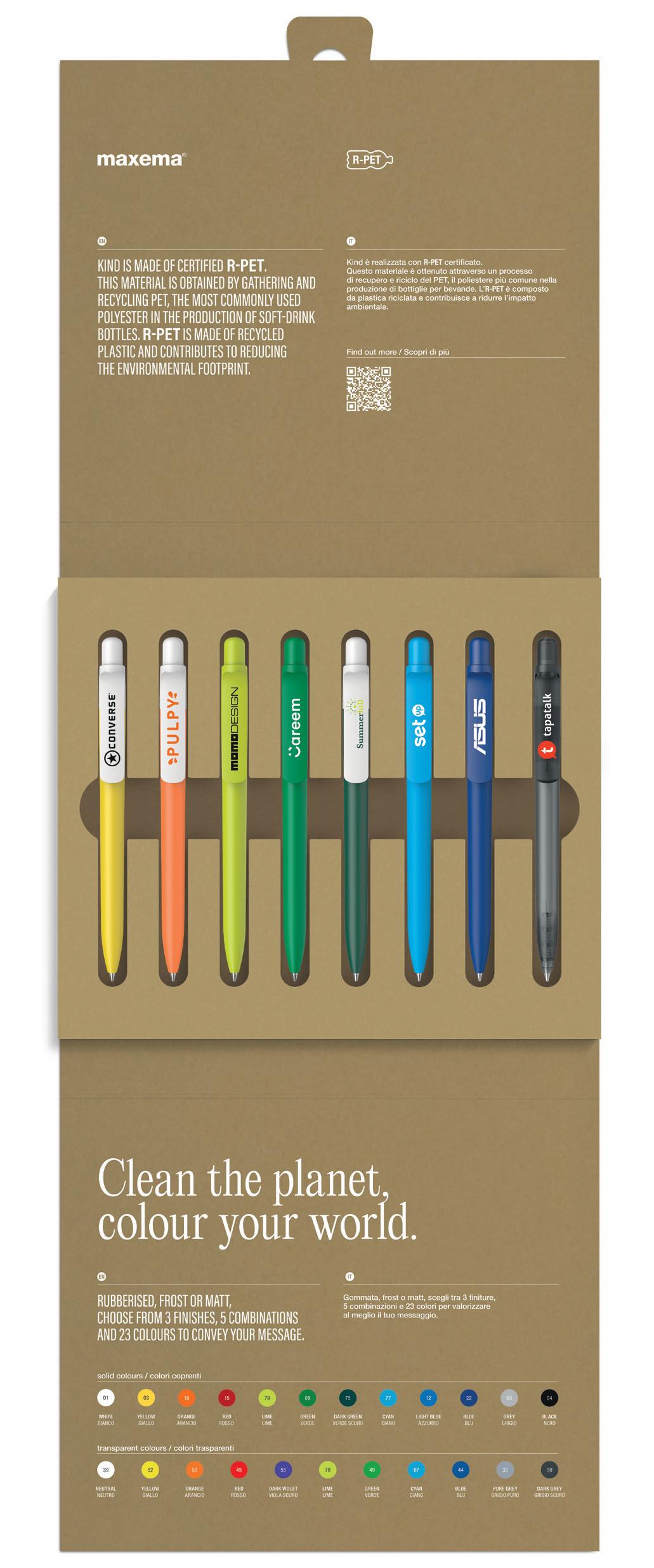 Contiene 8 penne KIND in plastica R-PET personalizzate, in colori e finiture assortite.