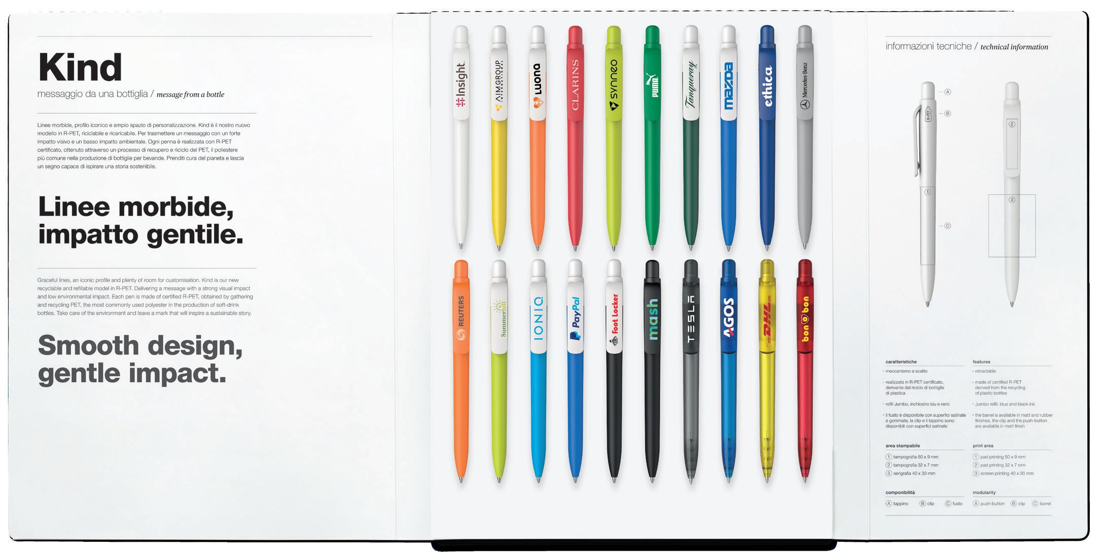 Contiene 20 penne KIND in plastica R-PET personalizzate, in colori e finiture assortite.