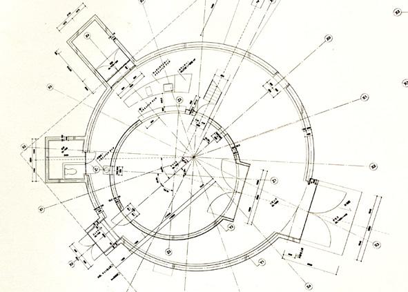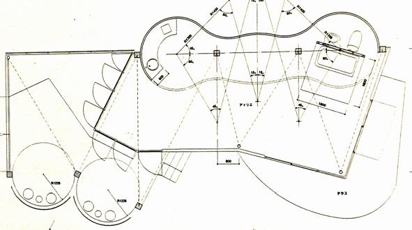 Forest ou le Lumiere Park Cafe. Dans ce projet, ils établissent une forme générée à partir d’un cumul d’arcs de cercles qui rationnalisent le dessin à la main. L’espace résultant permet de multiplier les relations entre les différentes “pièces” de la maison, ainsi que les relations visuelles et spatiales entre l’intérieur et l’extérieur. On peut également supposer que la réalisation d’une maquette de la maison à l’échelle 1 : 2 (Fig.9) a permis aux architectes de visualiser la richesse d’un tel espace et les a amenés à poursuivre leur recherche de composition de l’espace par la courbe.