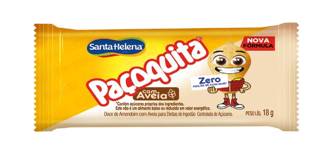 A proposta da Santa Helena Alimentos com o novo layout é promover a diferenciação visual dos produtos. As embalagens seguem o mesmo padrão de layout, mas com cores diversas: Paçoquita Zero com marcação azul, enquanto Paçoquita Aveia, bege, e Paçoquita Whey Protein, preto.