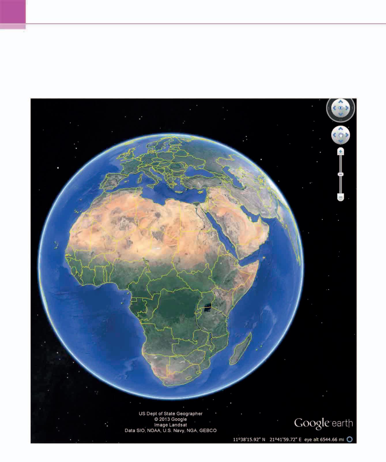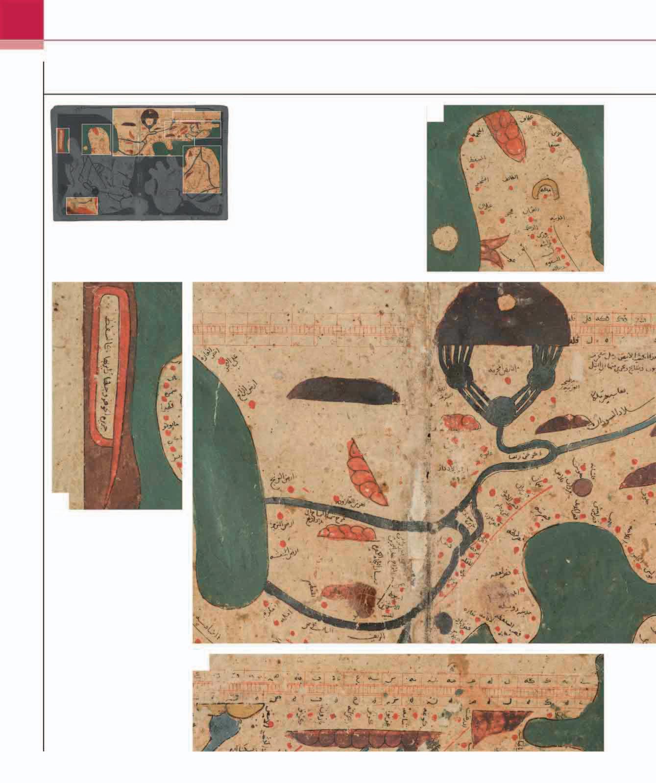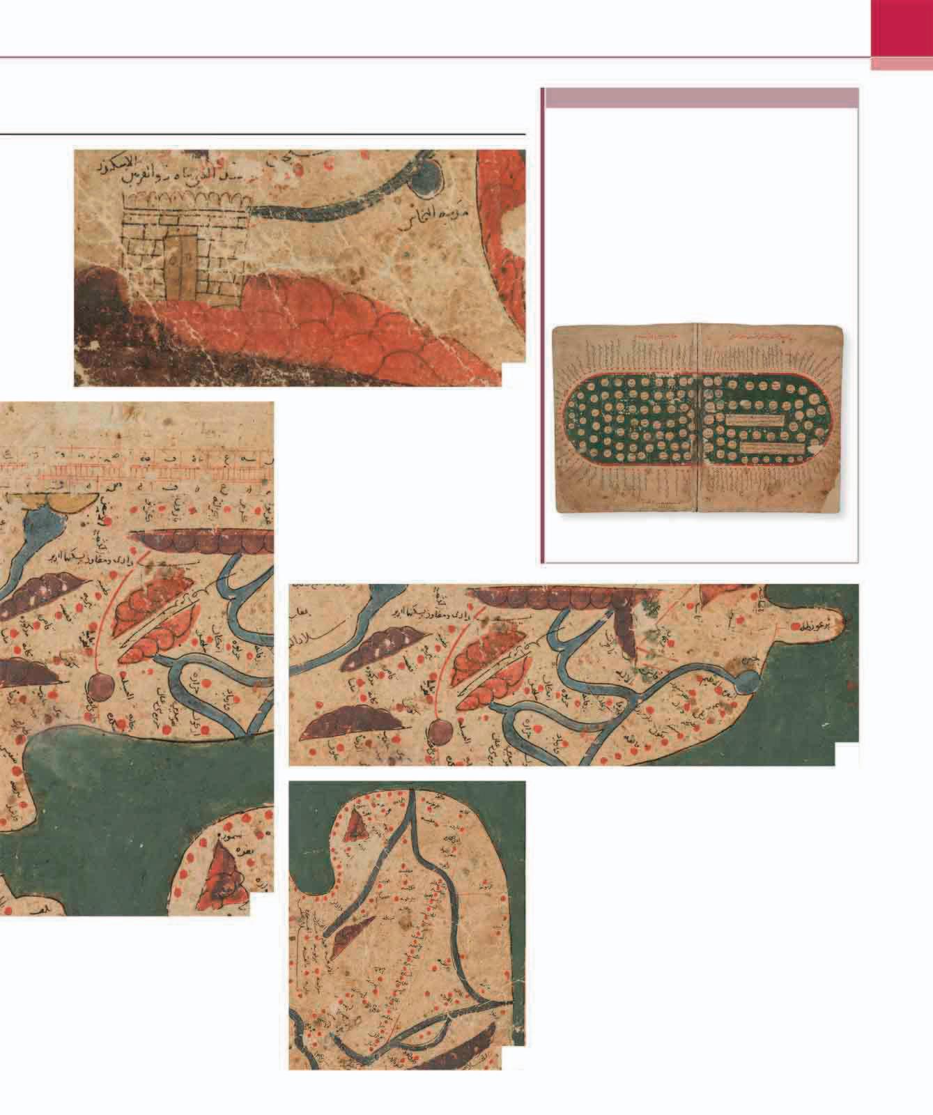 The map is oriented with south at the top, which is typical of Islamic cartography of the time, with the Arabian Peninsula and Mecca displayed with particular prominence. Europe, to the lower right, is dominated by a huge Iberian Peninsula, concentrated on Muslimcontrolled Spain. Meanwhile, North Africa dwarfs Italy and Greece, and it is shown in far greater detail, particularly Egypt and the complicated tributaries that make up the source of the Nile. Arabia is dominated by Mecca and is depicted at twice the size of India and Persia, while central Asia includes the Euphrates and Tigris rivers and the city of Constantinople (now Istanbul), which is noted as having a “Christian creed.” This region also retains mythological elements, such as Alexander the Great’s fabled wall built to keep out the monstrous Gog and Magog. Farther east, India and China are shown, but in increasingly hazy detail, while the limits of the inhabited world are represented on the far left by the mysterious “Island of the Jewel.” The scale bar along the top suggests the use of mathematical applications hitherto unknown in medieval mapmaking. Both book and map are heavily indebted to Greek sources, particularly the works of Ptolemy (see pp.24–27), as well as a variety of Arabic and Islamic authorities.