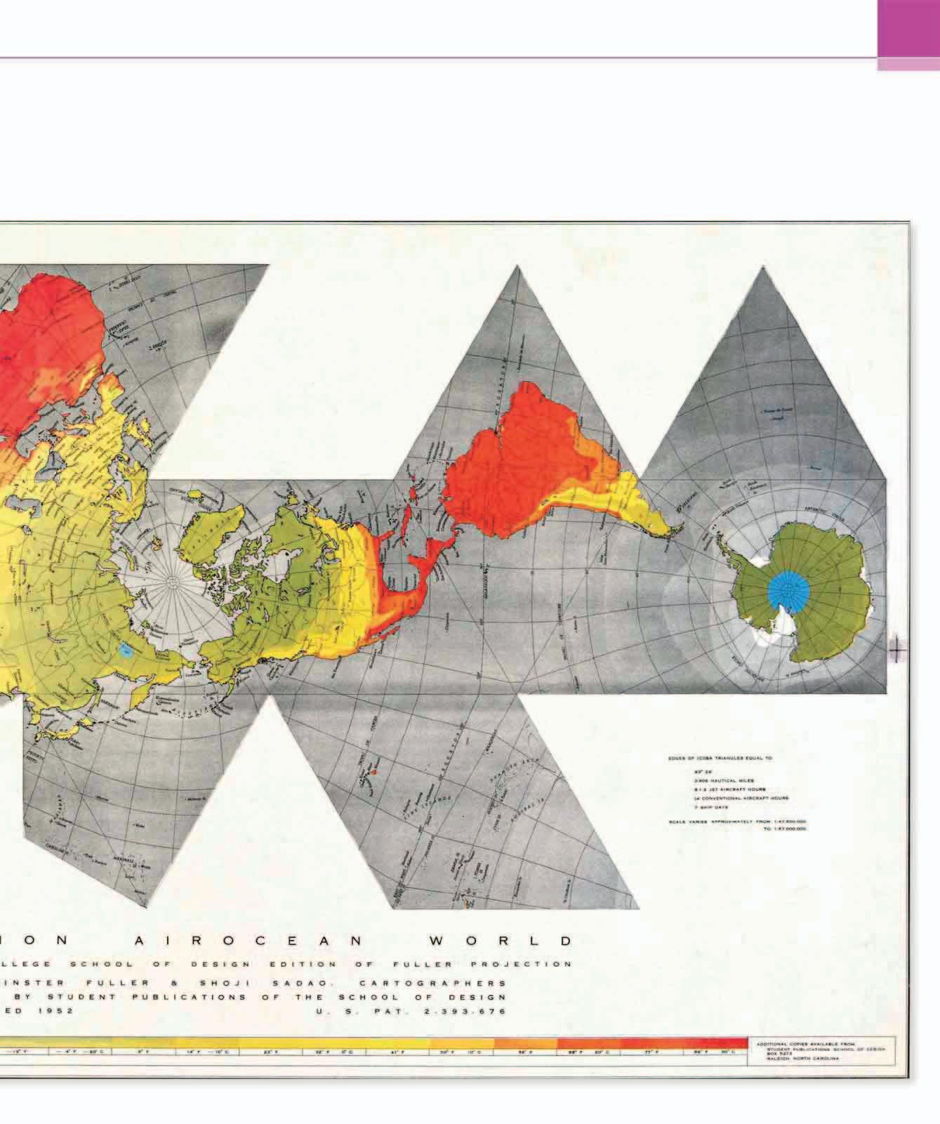 4 REDDEST AFRICA Compared with traditional maps, Africa looks “upside down,” but Fuller’s startling projection makes us realize that this is quite arbitrary. Its red hue is based on high temperature zones, although Fuller’s interest was more in how social patterns of migration and economic activity were defined by the coldness of a region, as opposed to its heat.