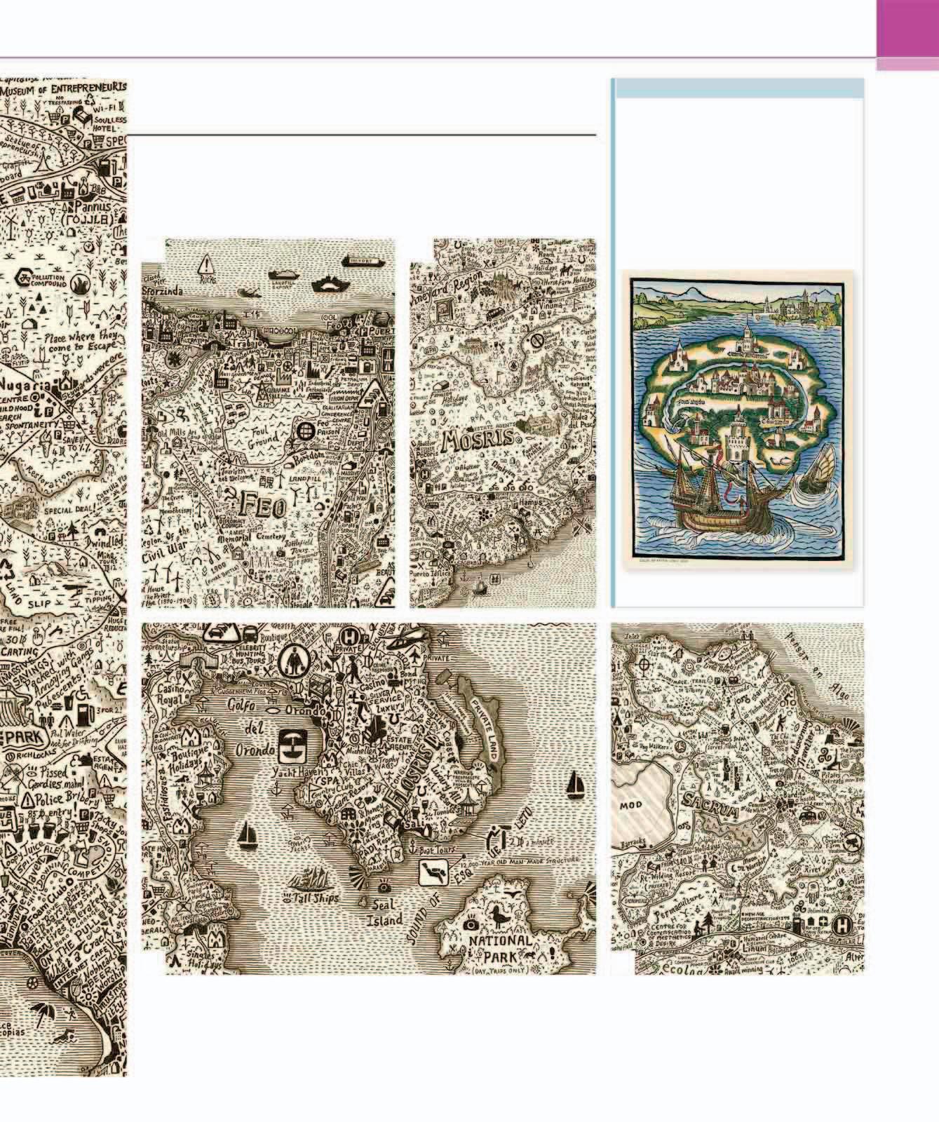 Walter’s map of Utopia is part of a long artistic tradition, going back to Ambrosius Holbein’s 1518 woodcut (see pp.94–95). Nova Utopia’s “aesthetic template” is a Renaissance map of Utopia made by the famous Flemish mapmaker Abraham Ortelius in 1598, which was directly inspired by Thomas More’s Utopia (1516). Mapmakers and artists such as Walter are interested in Utopia as a graphic “no place,” an invented world upon which they can project a range of contemporary hopes and fears.