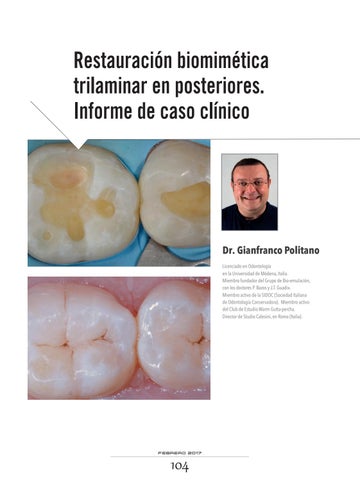 Dr. Gianfranco Politano Licenciado en Odontología en la Universidad de Módena, Italia. Miembro fundador del Grupo de Bio-emulación, con los doctores P. Bazos y J.T. Guadix. Miembro activo de la SIDOC (Sociedad Italiana de Odontología Conservadora). Miembro activo del Club de Estudio Warm Gutta-percha. Director de Studio Calesini, en Roma (Italia).