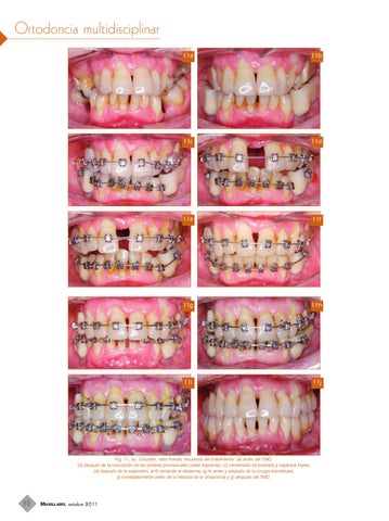 Fig. 11, a-j. Oclusión, vista frontal, secuencia del tratamiento: (a) antes del TMD, (b) después de la colocación de las prótesis provisionales sobre implantes, (c) cementado de brackets y expansor Hyrax, (d) después de la expansión, (e-f) cerrando el diastema, (g-h) antes y después de la cirugía mandibular, (i) inmediatamente antes de la retirada de la ortodoncia y (j) después del TMD.