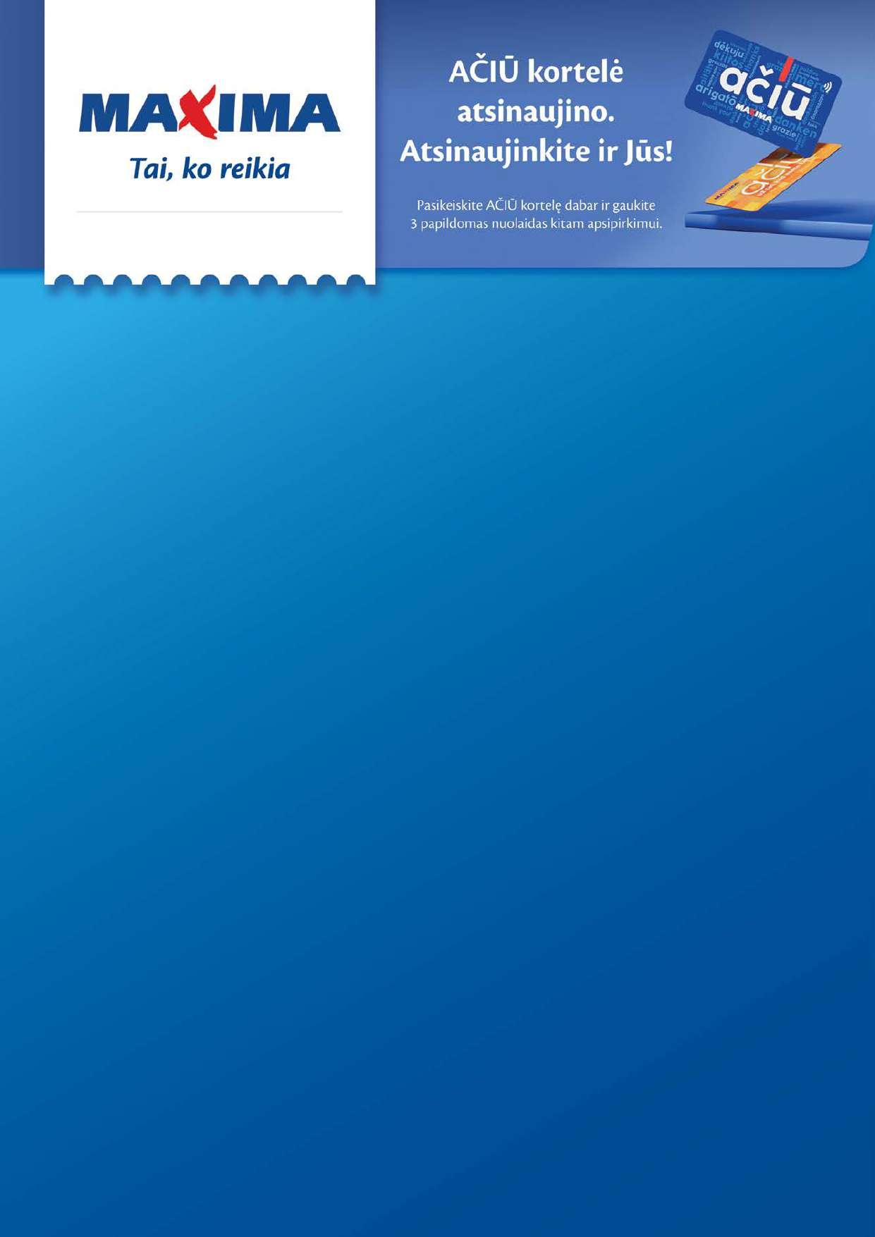 Tik spalio 1–31 d. Kainos su AČIŪ kortele taikomos MAXIMOS X, XX, XXX, XXXX parduotuvėse. MĖNESIO SUPERŽVAIGŽDĖS nuo šiol visose parduotuvėse MAXIMA! Paruošėme Jums žymių prekių ženklų pasiūlymų itin geromis kainomis. Antra prekė 1 ct* Perkant 1 makaronų DIVELA pakuotę, antra tokios pačios arba žemiausios kainos makaronų DIVELA pakuotė kvite – 1 ct** Be AČIŪ kortelės 4 09 € 2 45€ Kečupas HEINZ** 700 g 1 kg – 3,50 €; be AČIŪ – 5,84 € prieskoniams ir kepinių priedams KOTANYI**%-50 * 2 00 € 3 vnt. už Kaina su AČIŪ kortele taikoma vienam pirkėjui, perkančiam ne daugiau kaip 12 skard. Gazuotas sulčių gėrimas SAN PELLEGRINO** 3 skard. x 330 ml 1 l – 2,02 € Pasirinkite iš 4 rūšių produktams ALPRO**%-40 Kainos etiketėse nurodytos jau su nuolaida. Be AČIŪ kortelės 2 15 € 1 29€ Pieno batonėlis KINDER MAXI KING 1 pak. (3 bat. x 35 g) 1 kg – 12,29 €; be AČIŪ – 20,48 € Be AČIŪ kortelės 4 59 € 2 75€ Šaldytas KIJEVO kotletas FOOD STORIES 290 g 1 kg – 9,48 €; be AČIŪ – 15,83 € Perkant 2 ar daugiau traškučių CHAZZ pakuočių, taikoma 40 % nuolaida**%-40 * Perkant 2 ar daugiau lėtai virtiems gaminiams BIOVELA**%-40 Kainos etiketėse nurodytos jau su nuolaida. 3