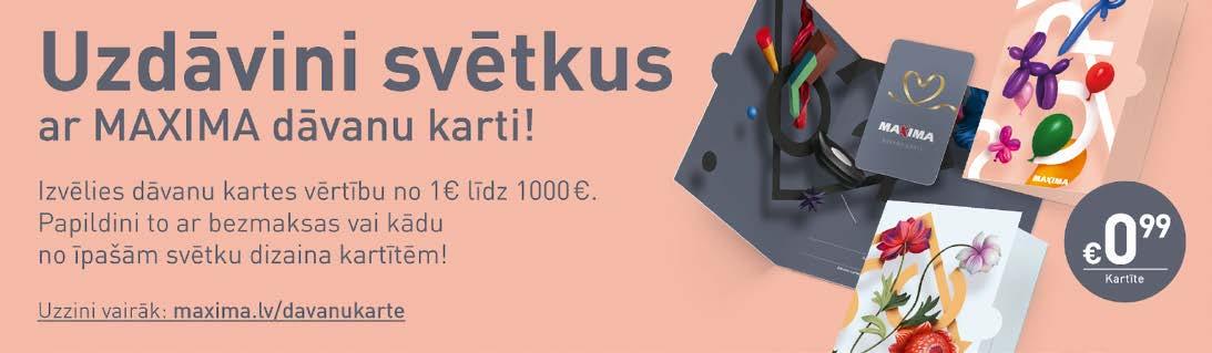 Piedāvājums var būt atšķirīgs Maxima X veikalos. Ar aktuālo preču piedāvājumu aicinām iepazīties veikalā! Attēliem ir ilustratīva nozīme. Reklāmā minētajai informācijai var būt operatīvas izmaiņas par kurām informēsim pircējus veikalā. Ja izdevumā norādītā preces cena nesakrīt ar veikalā esošo, par pareizo lūdzam uzskatīt veikalā norādīto cenu. Bezmaksas informatīvais tālrunis: 80002020, no plkst. 8.00 līdz 22.00. E-pasts: info@maxima.lv; www.maxima.lv * Cena pie preces norādīta ar atlaidi. ** Cena pie preces norādīta bez atlaides.
