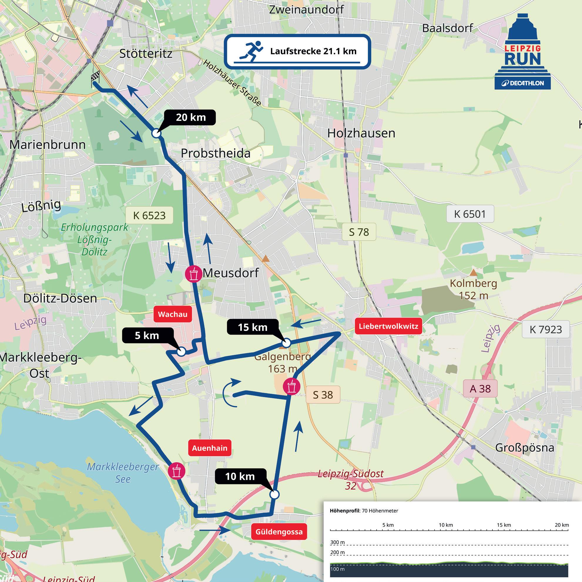 Von Leipzig aus geht es über den Ortsteil Wachau direkt zum Uferrundweg am Markkleeberger See. Dieser Streckenabschnitt ist landschaftlich ein Highlight, das ehemalige Tagebaugebiet ist heute Herzstück des Leipziger Neuseenlandes mit zahlreichen touristischen Möglichkeiten. Vom Markkleeberger See geht es über Güldengossa nach Osten über die ehemaligen Gefechtsfelder der Völkerschlacht. Hier ist die Hälfte des Halbmarathon Leipzig absolviert. Im weiteren Streckenverlauf geht es nach Liebertwolkwitz, großflächig war dieser Bereich 1813 durch die Völkerschlacht geprägt.