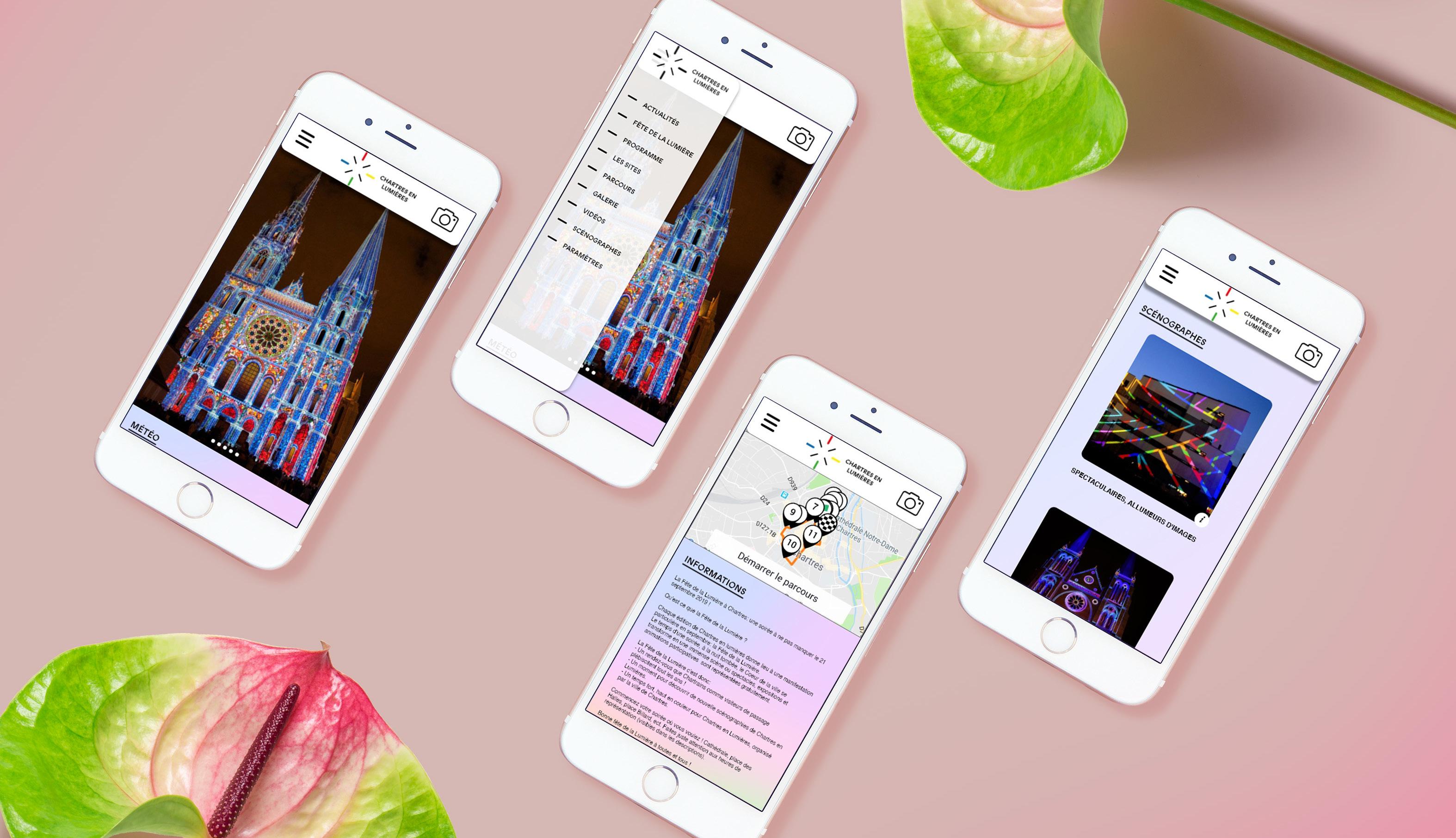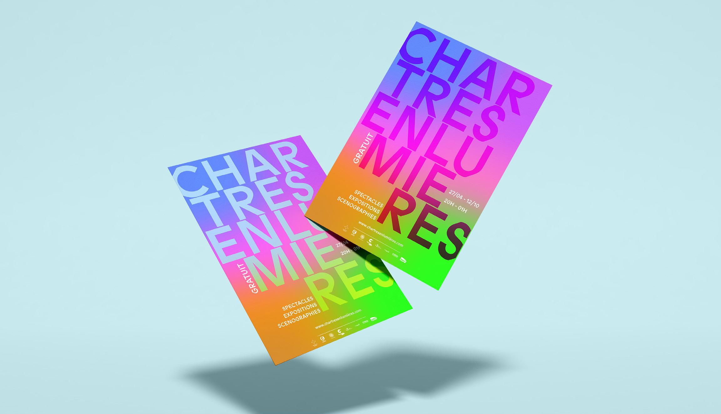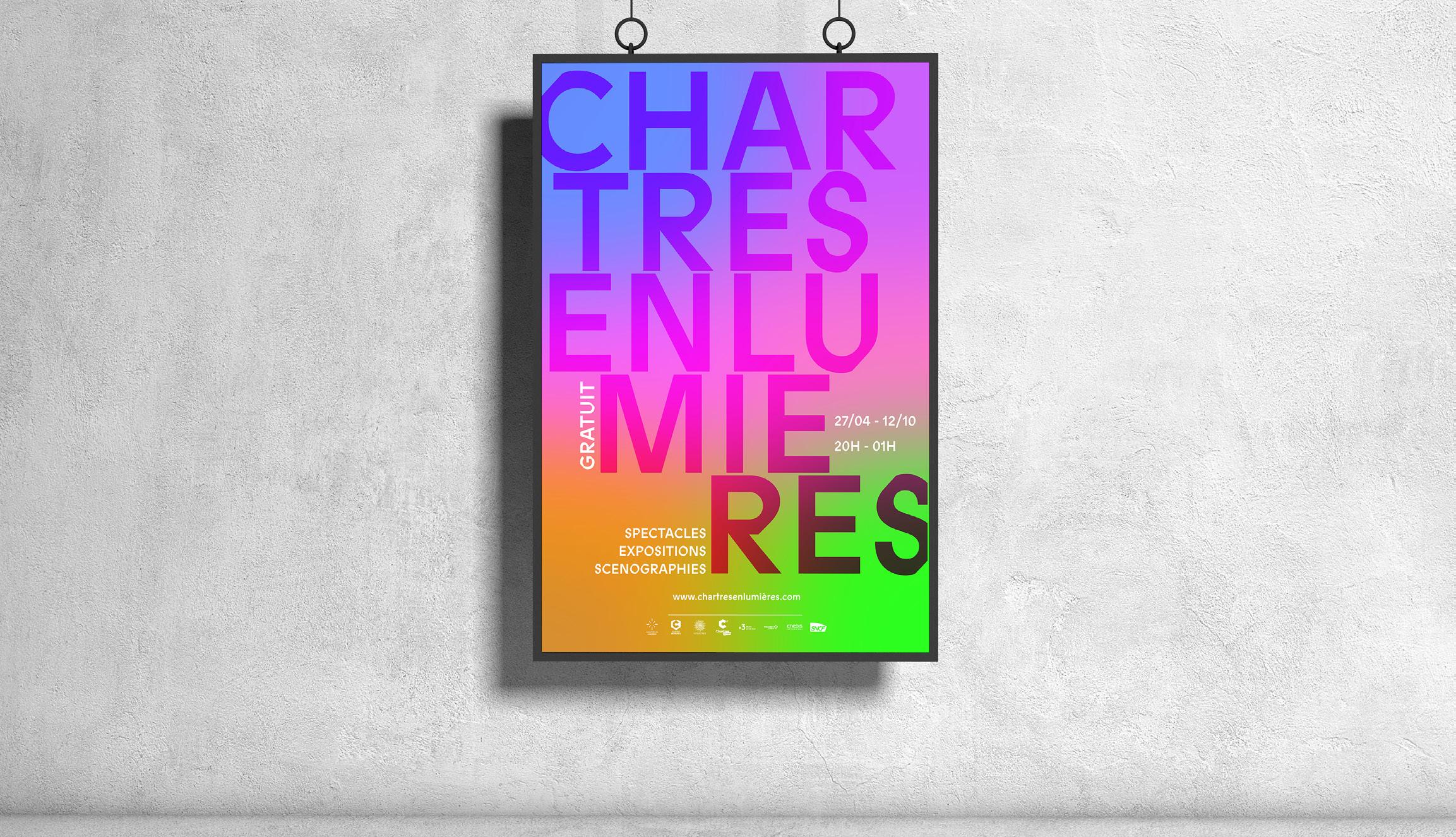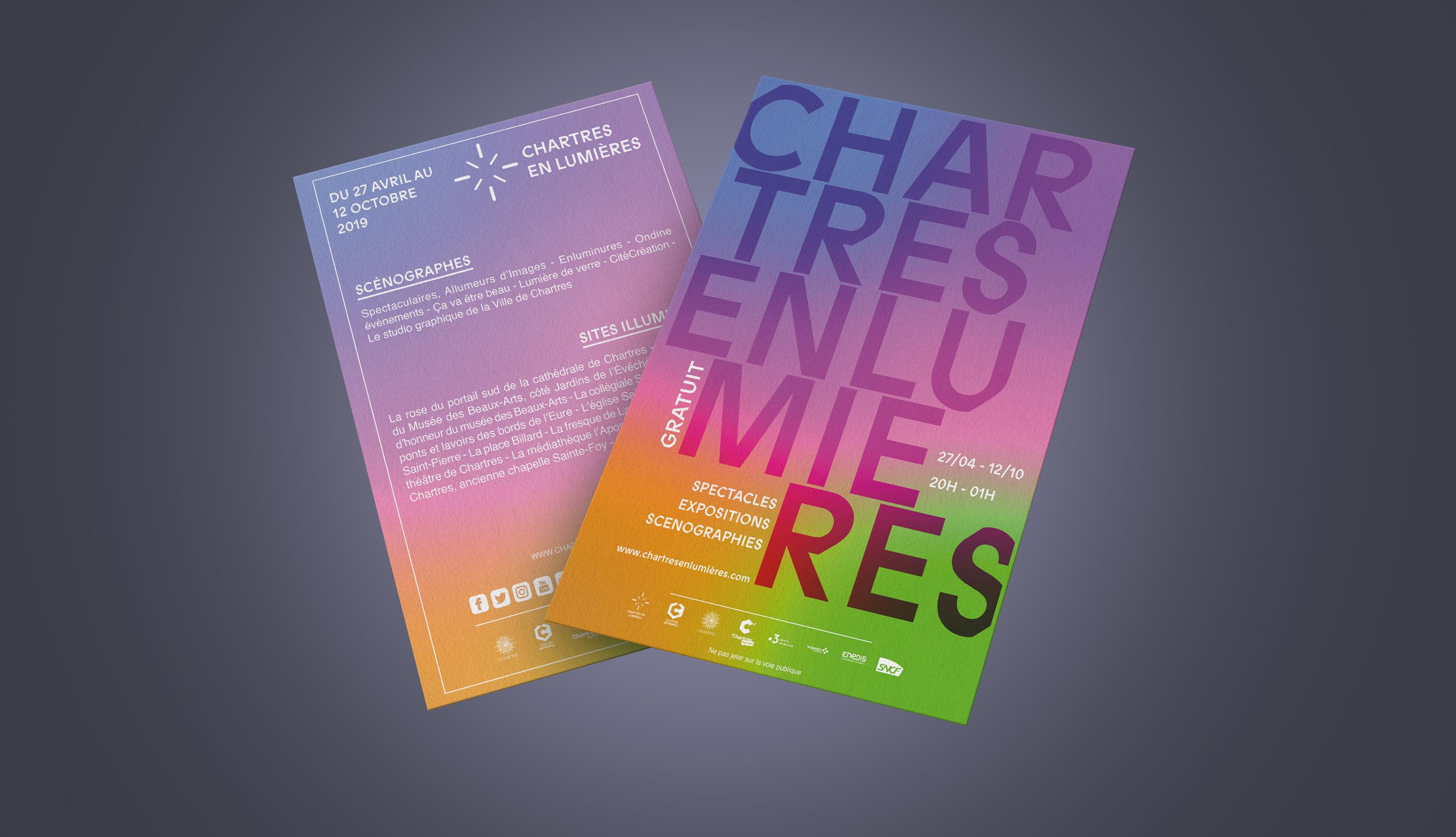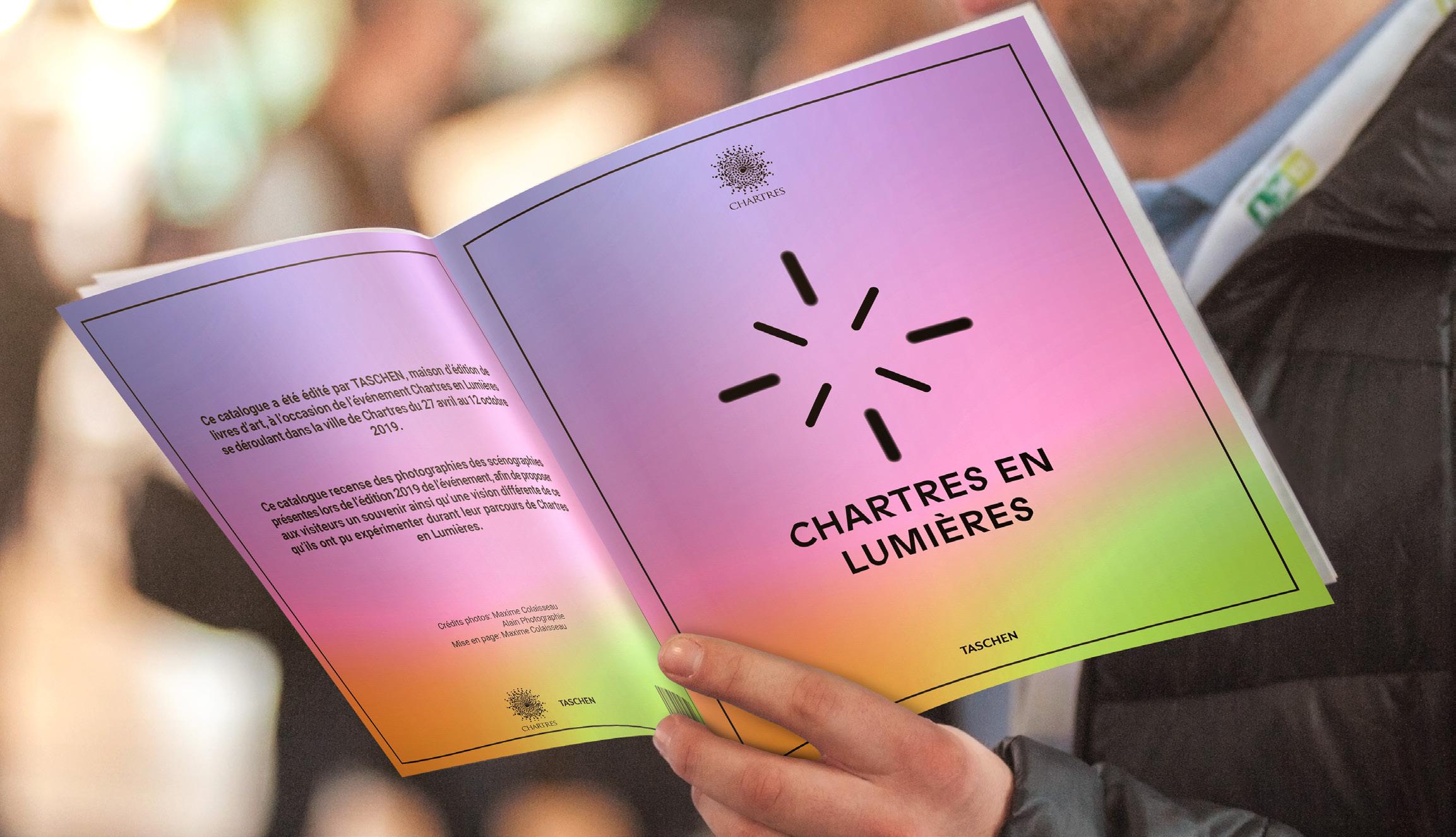 Le projet, fictif, est de réaliser l’identité visuelle de l’événement «Chartres en Lumières» se déroulant à Chartres. Il intervient dans un contexte à la fois culturel et sociétal. Le but de la demande est de mettre en avant l’événement «Chartres en Lumières», lancé en 2003 par la ville et se déroulant d’avril à octobre. Cet évènement permet à la ville de faire rayonner son patrimoine à travers des scénographies liant lumières et musiques et des visites guidées autour des monuments. C’est dans ce contexte mêlant histoire et art contemporain que la communication de cet évènement joue un rôle important. Elle se déclinera sous différents supports, à commencer par la charte graphique ainsi que des supports de communications print: série d’affiches, flyers. Il y a également les supports numériques réalisés sous forme de maquettes, comme la modernisation du site web ainsi que de l’application mobile. Enfin, la création d’un catalogue d’exposition regroupant les scénographies de l’année en cours, chaque année ayant son catalogue.