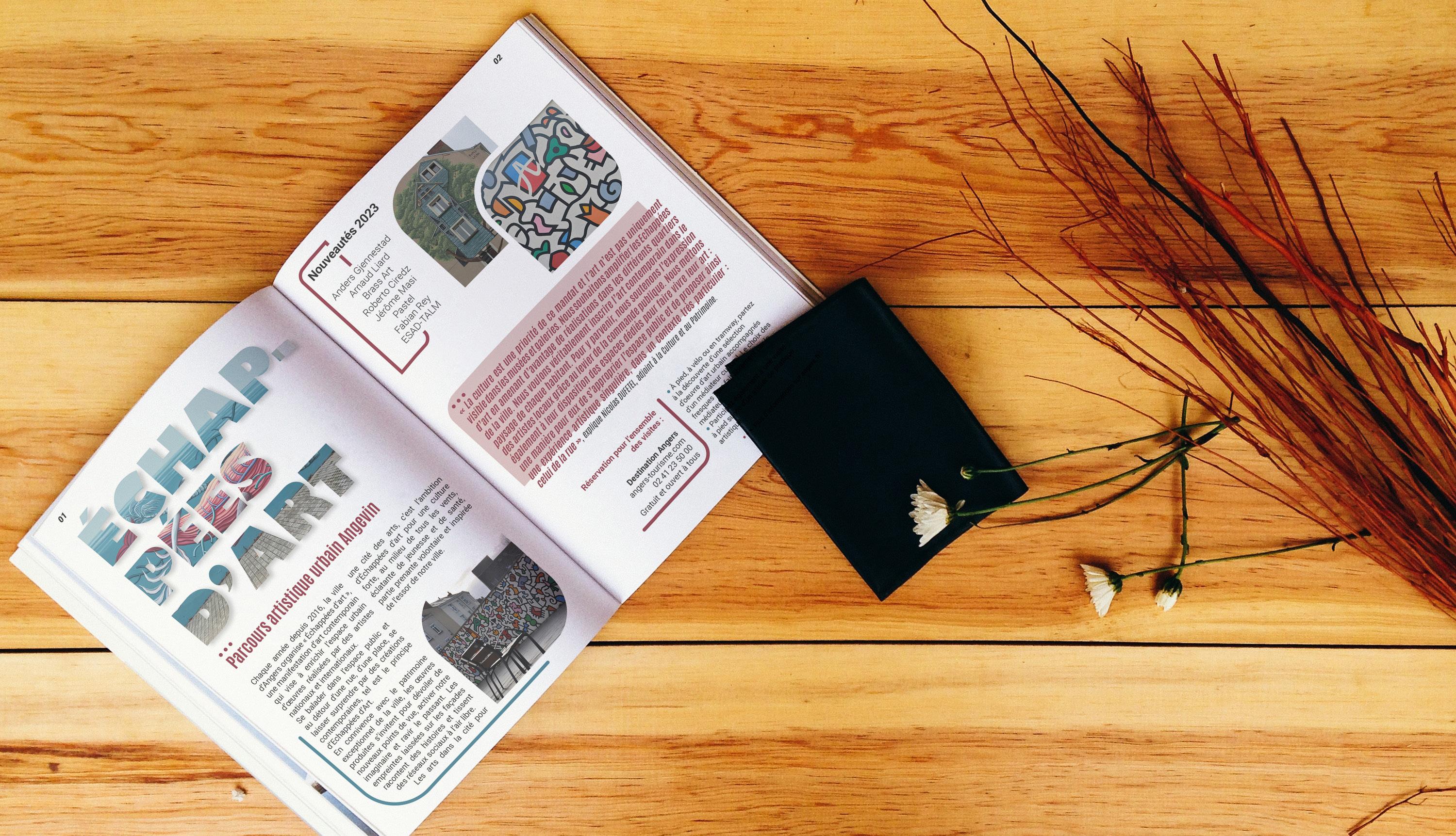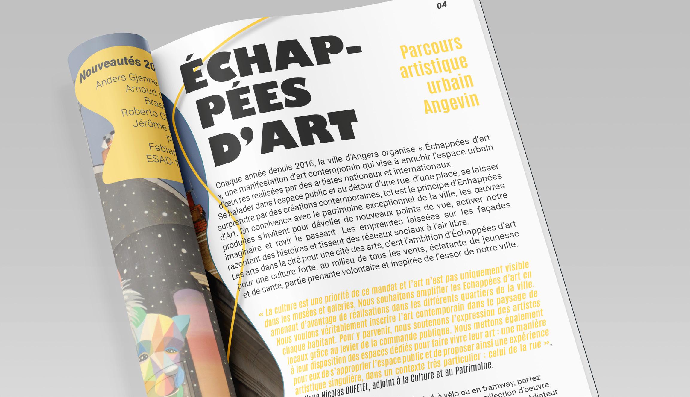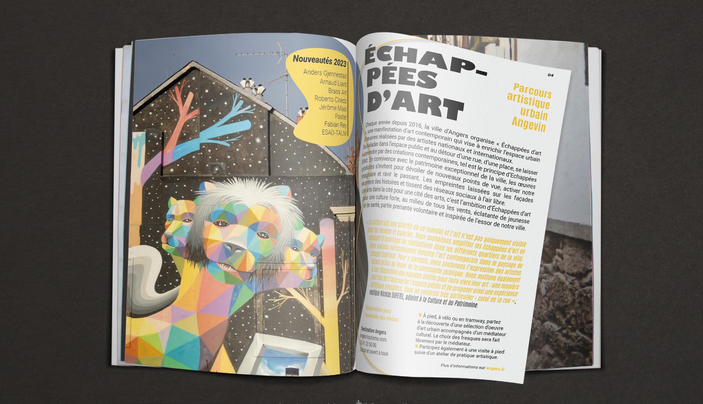 Le directeur artistique de l’agence vous donne pour mission de réaliser la mise en page d’une double page pour un magazine qui sera distribué en office de tourisme dans le Maine-et-Loire. Cette double page concernera le festival «Échappées d’Art», une manifestation d’art contemporain lancée chaque année par la Ville d’Angers depuis 2016. Vous prendrez directement vos clichés réalisés durant ce parcours artistique urbain afin d’habiller et illustrer le contenu des pages.