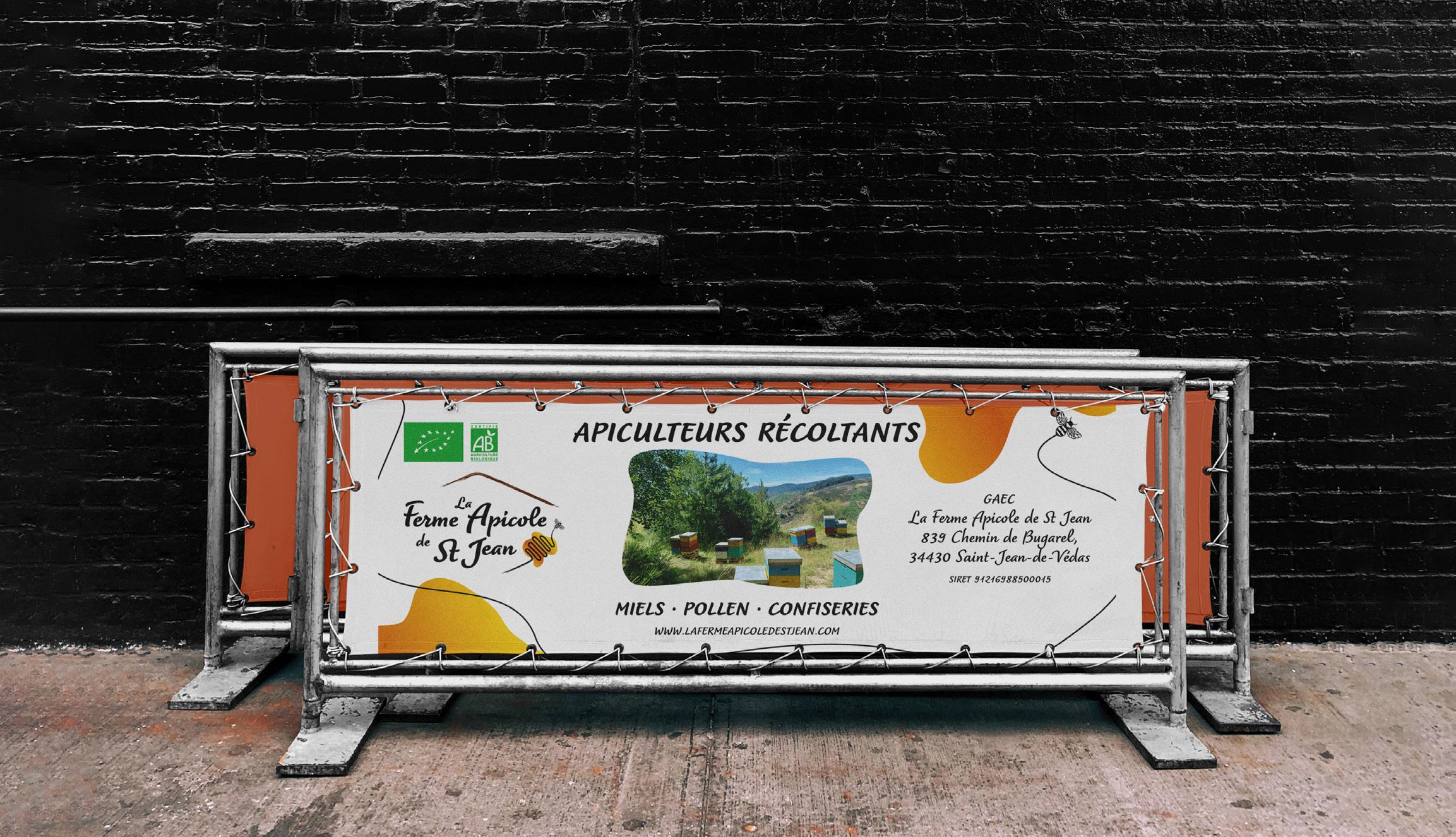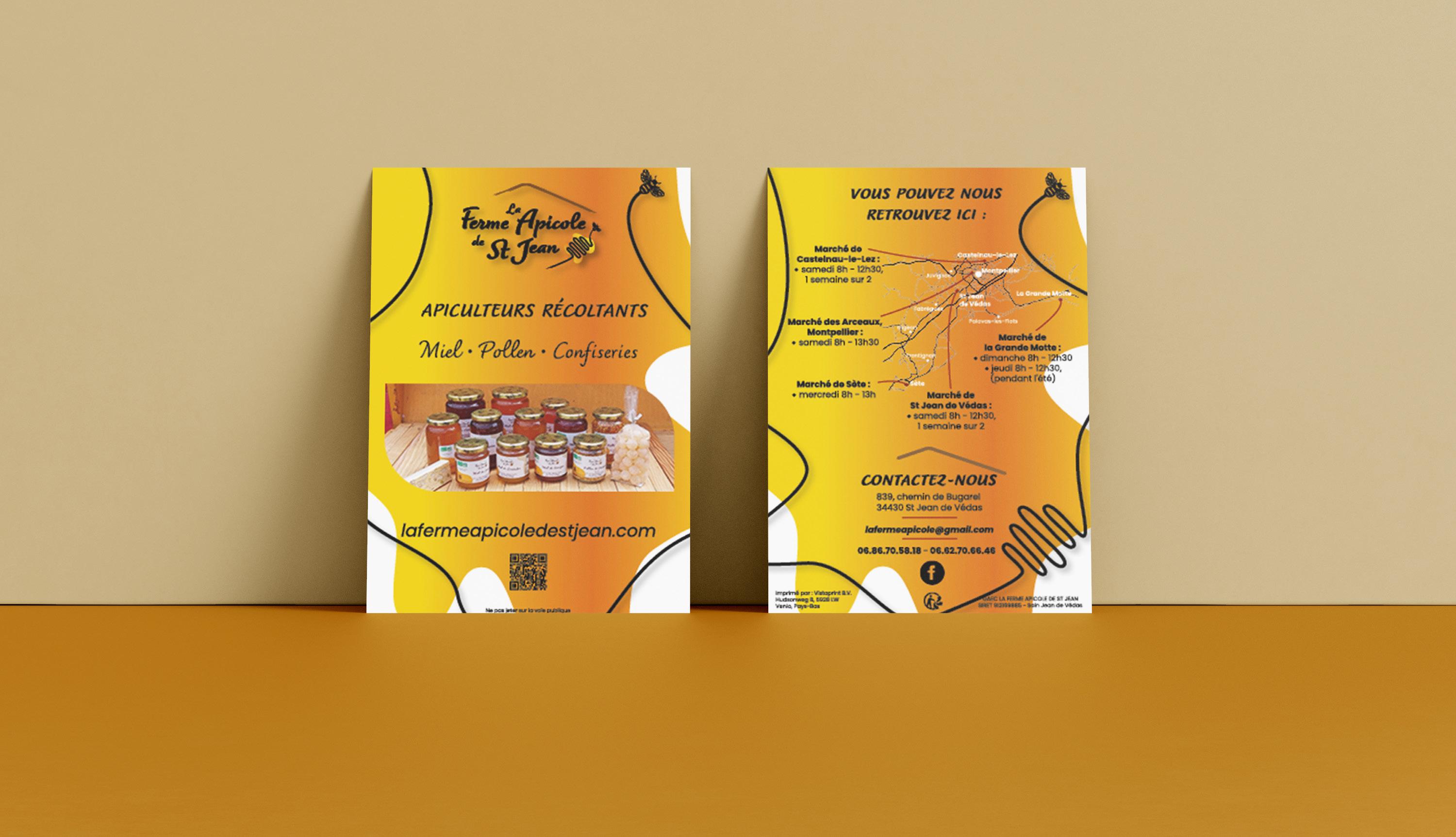 «La Ferme Apicole de St Jean» a fait appel à moi afin de réaliser leur identité visuelle, et toute leur communication print et digitale. Leur objectif était de promouvoir leur activité en développant leurs moyens de communications, qu’ils n’avaient pas réellement. De la création du logo et de la charte graphique, du flyer, du site web, en passant par les banderoles et les étiquettes, il fallait améliorer la visibilité en développant une identité de marque forte, avec leurs valeurs et leur univers, à travers tout ces éléments de communications. Cela leur permet de mieux se démarquer, de mieux communiquer, et de pouvoir augmenter les ventes en attirant une nouvelle clientèle.