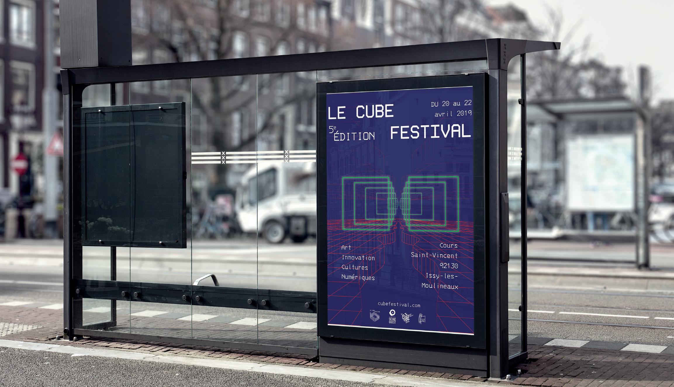 Le Cube Festival, grand événement sur les arts numériques, nous demande de concevoir la nouvelle identité visuelle de l’édition 2019. Pour son grand retour, le festival souhaite marquer les esprits par la création d’une identité innovante et futuriste. Il fallait donc créer un visuel expérimental propre au festival. Cette identité devra pouvoir s’adapter aux différents supports de communication print et numériques. Elle s’incarnera à travers la création d’un logotype fixe et en mouvement dans un teaser vidéo pour le festival.