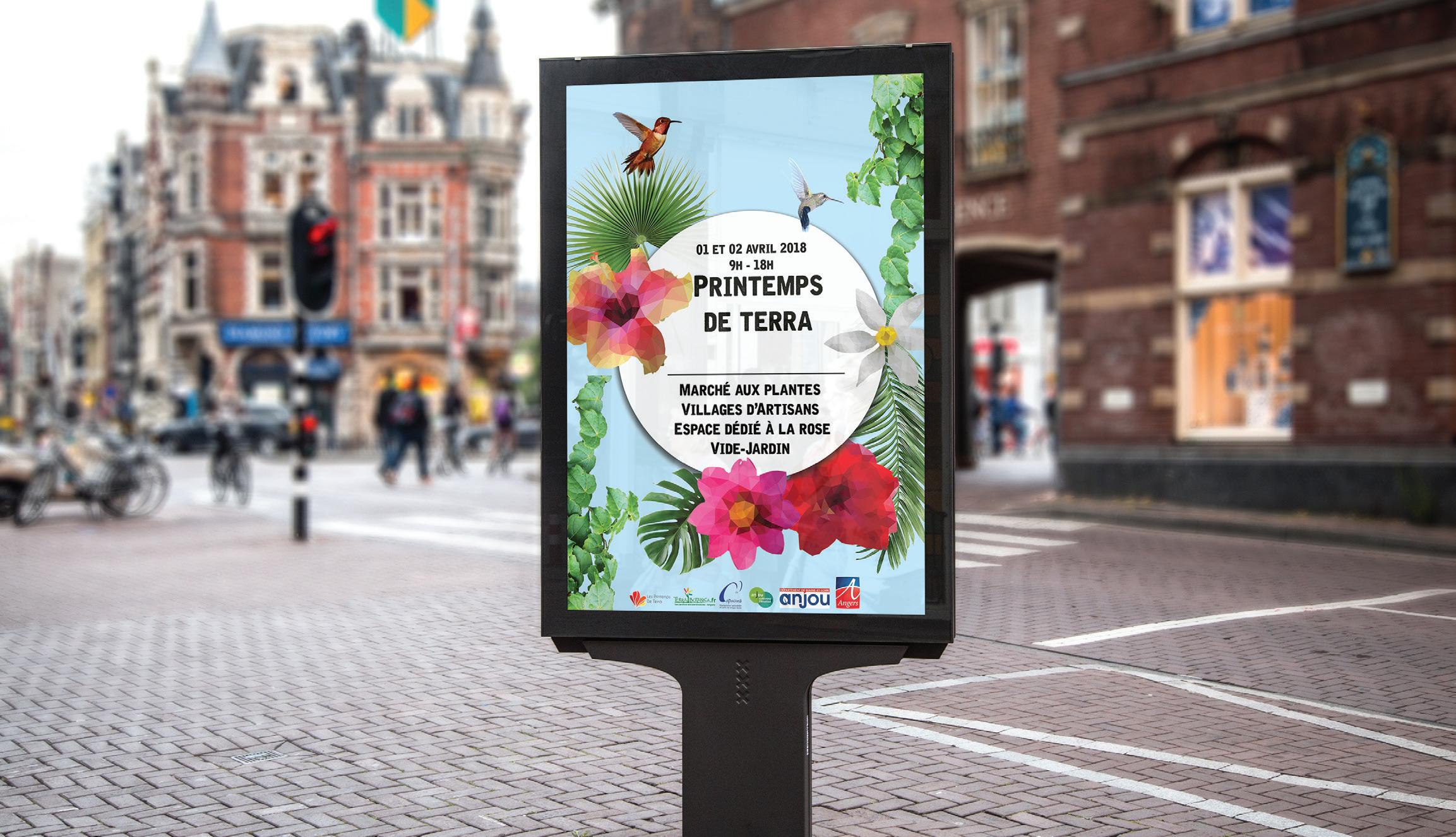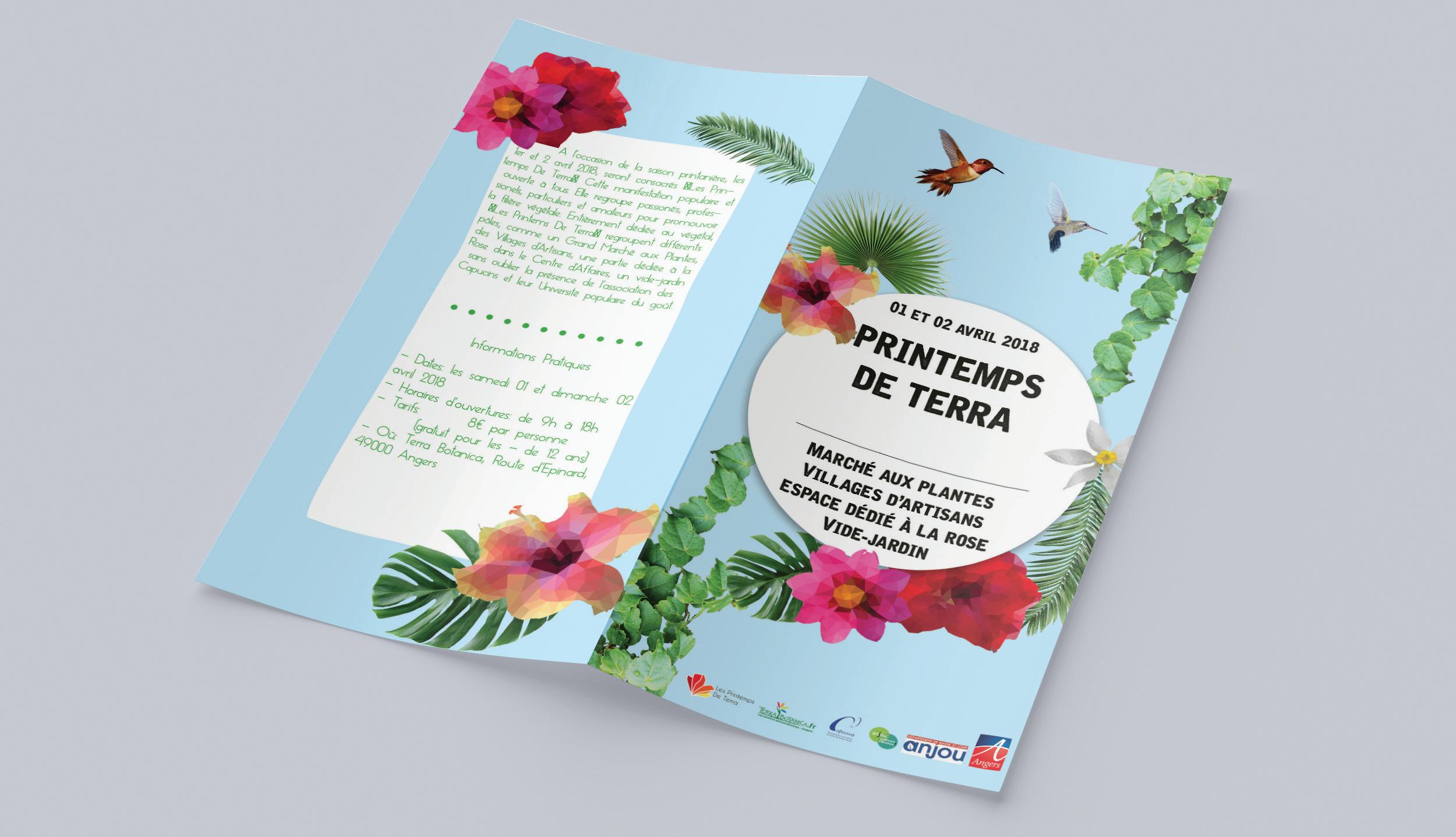 Entièrement dédiés au végétal, « Les Printemps de Terra» regroupent différents pôles comme une Grand Marché aux Plantes, des Villages d’Artisans, une partie dédiée à la rose dans le centre d’Affaires, un vide-jardin sans oublier la présence de l’association des Capucins et leur Université populaire du goût. Pour cette occasion, vous devez communiquer sur cet événement en créant un logo, une affiche créative et festive, un flyer recto/verso reprenant le visuel de l’affiche adaté au format du flyer et présentant un programme au verso.