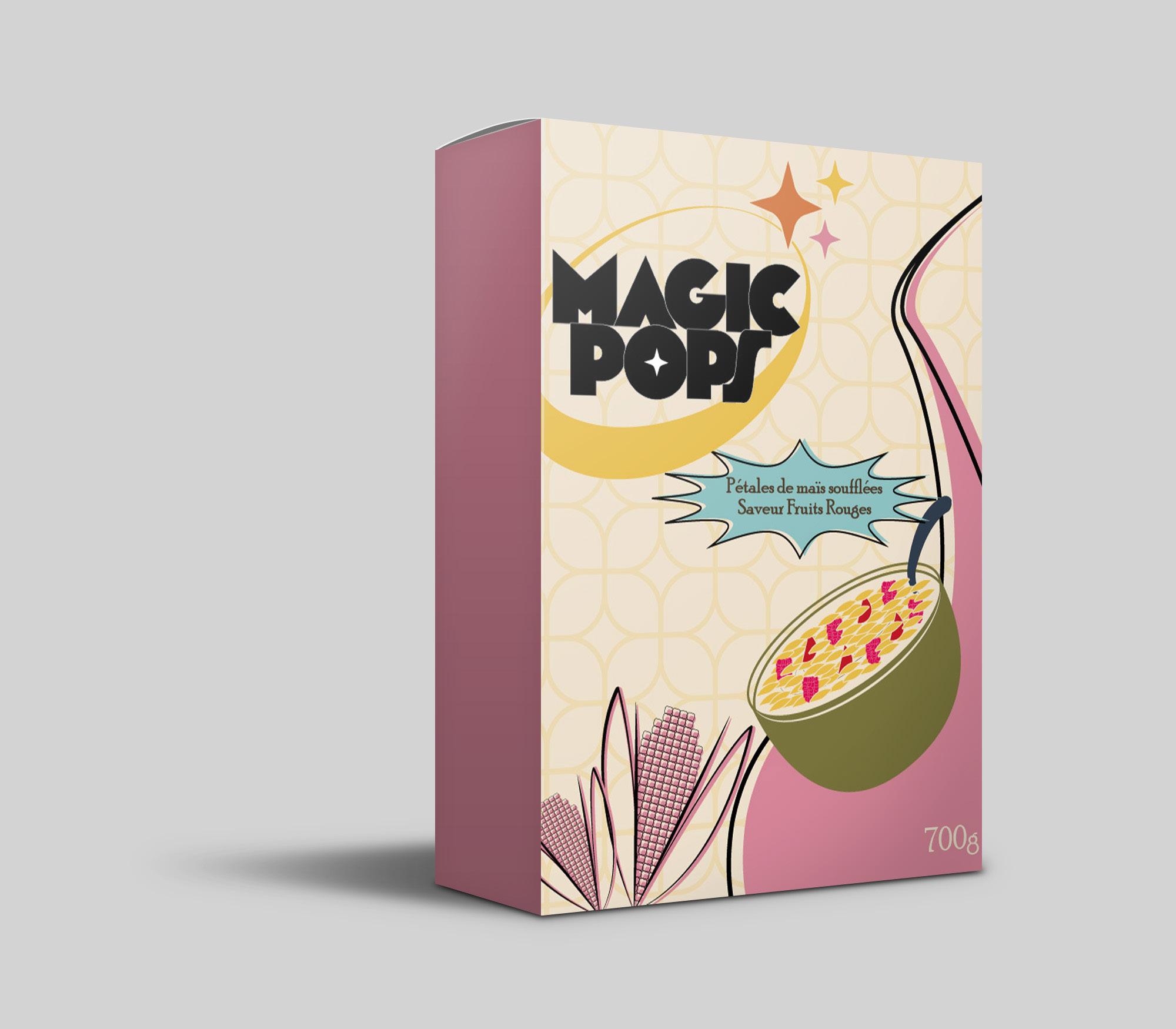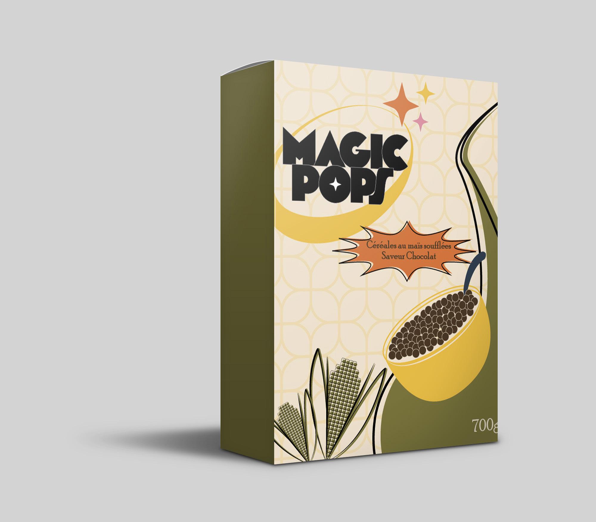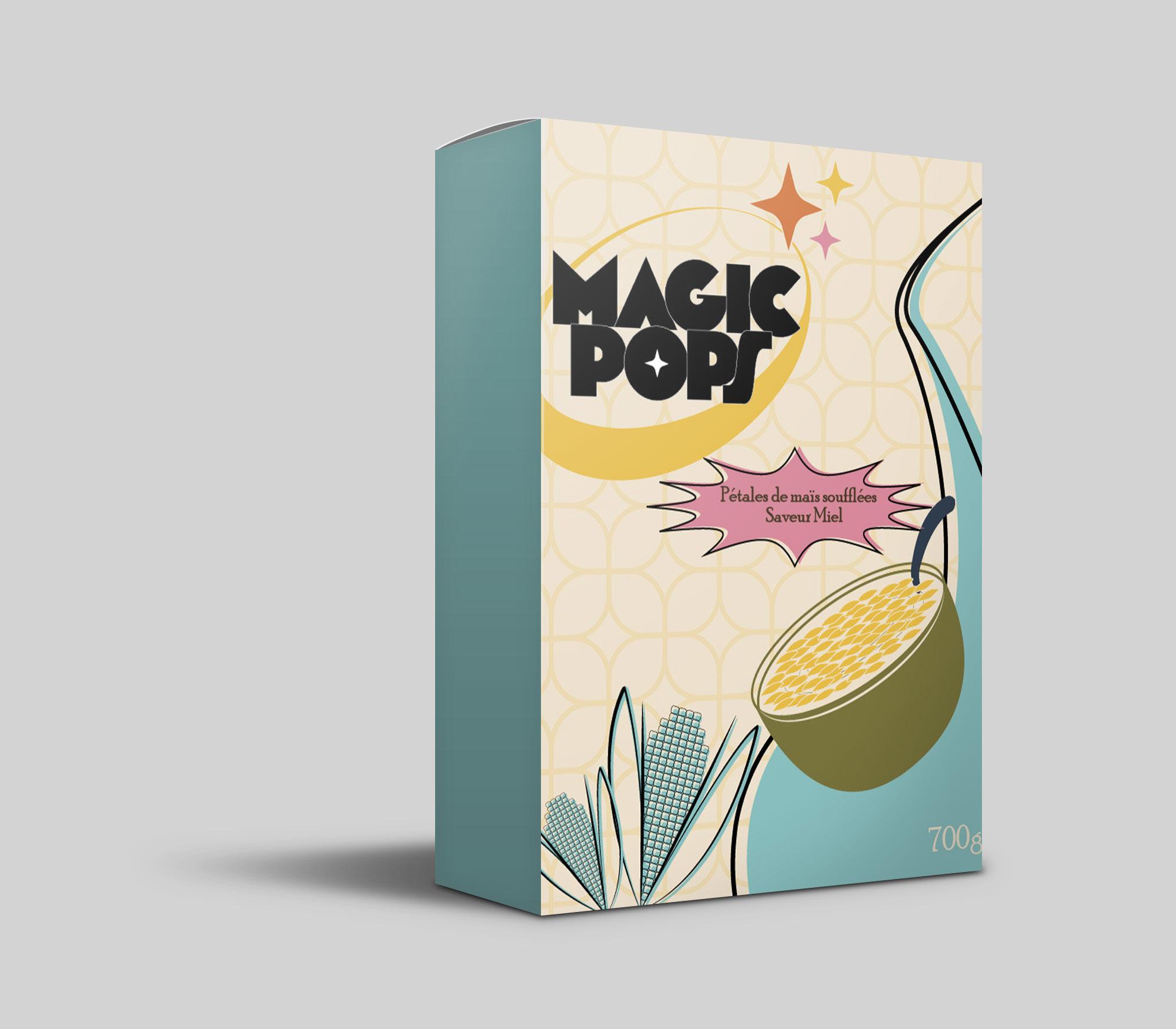 Le directeur artistique de l’agence vous donne pour mission de créer l’habillage graphique d’un emballage pour une boîte de céréales de la marque «MagicPops». À ce jour il n’existe aucune identité visuelle associée à cette marque. Les céréales sont à base de maïs soufflé et peuvent être au chocolat, aux fruit rouges ou au miel et d’autres saveurs seront à venir prochainement. Le client souhaite donc un habillage graphique déclinable en fonction des parfums.