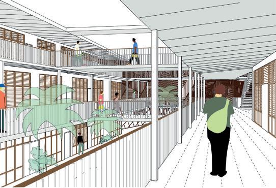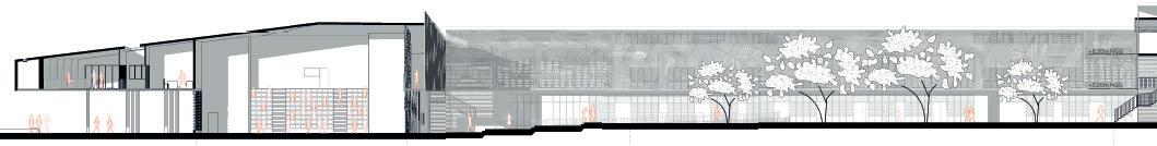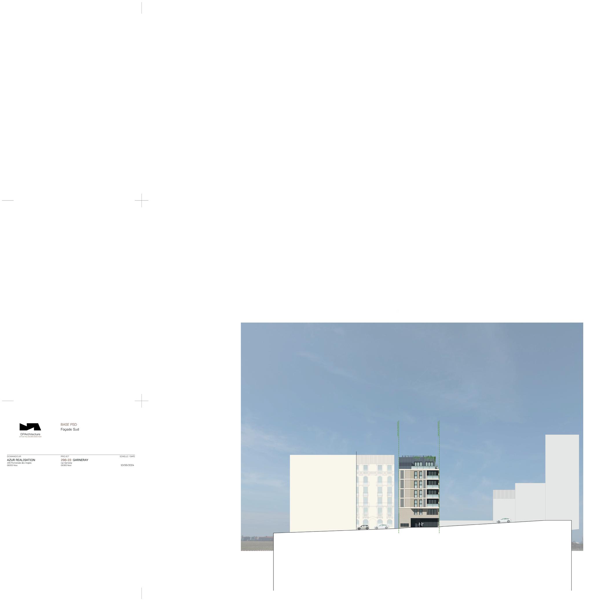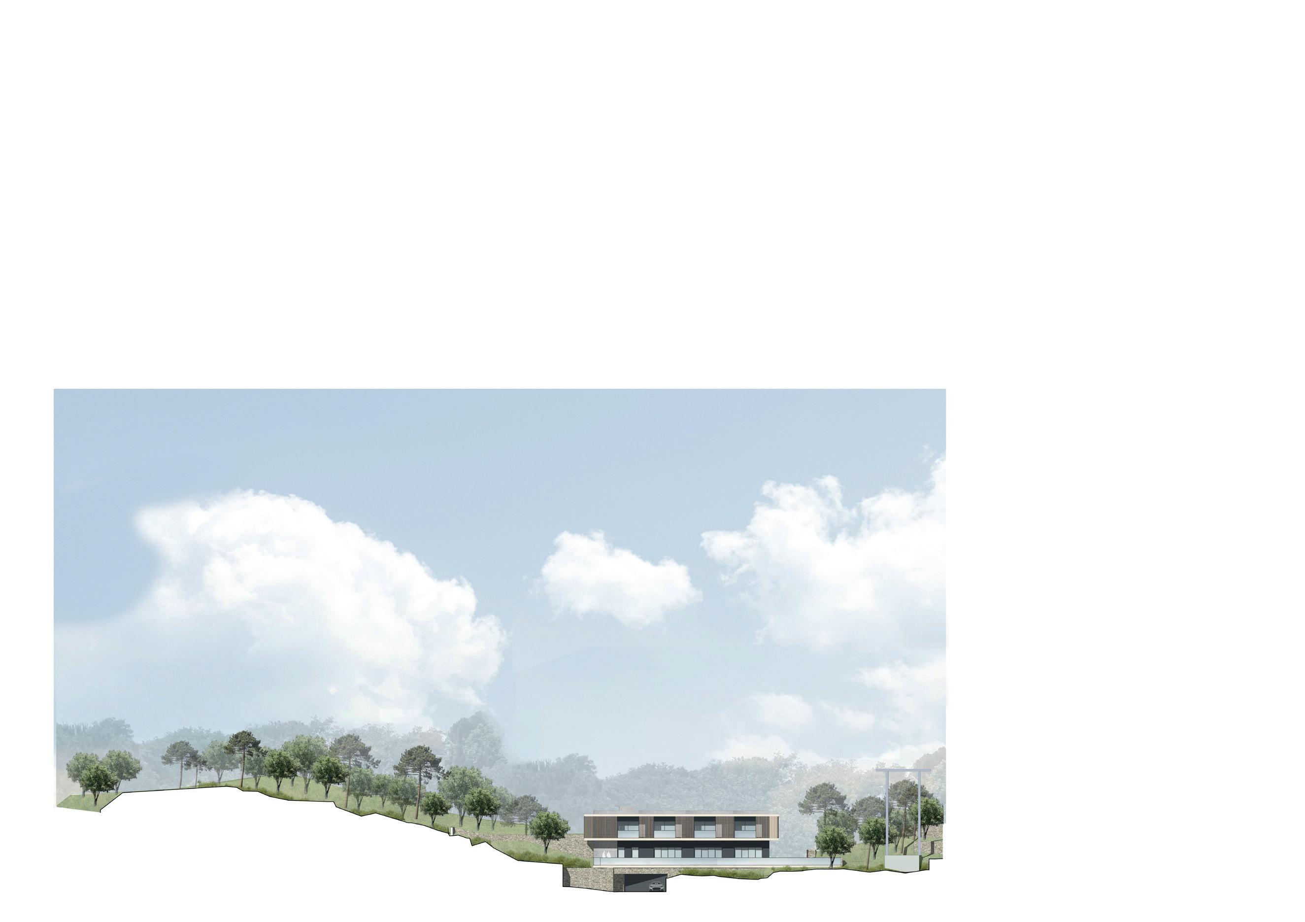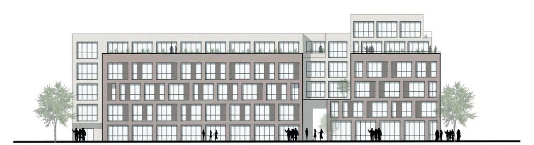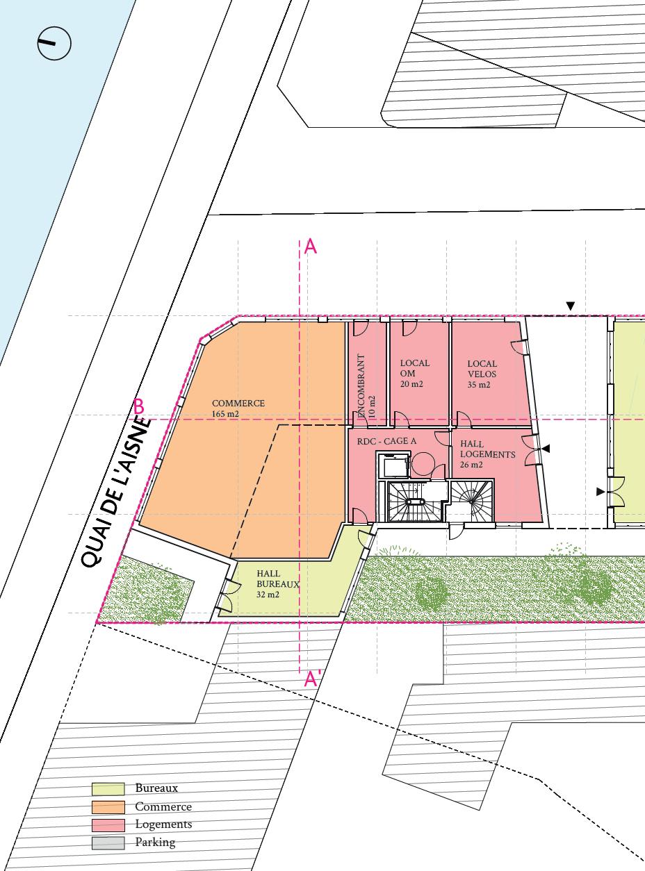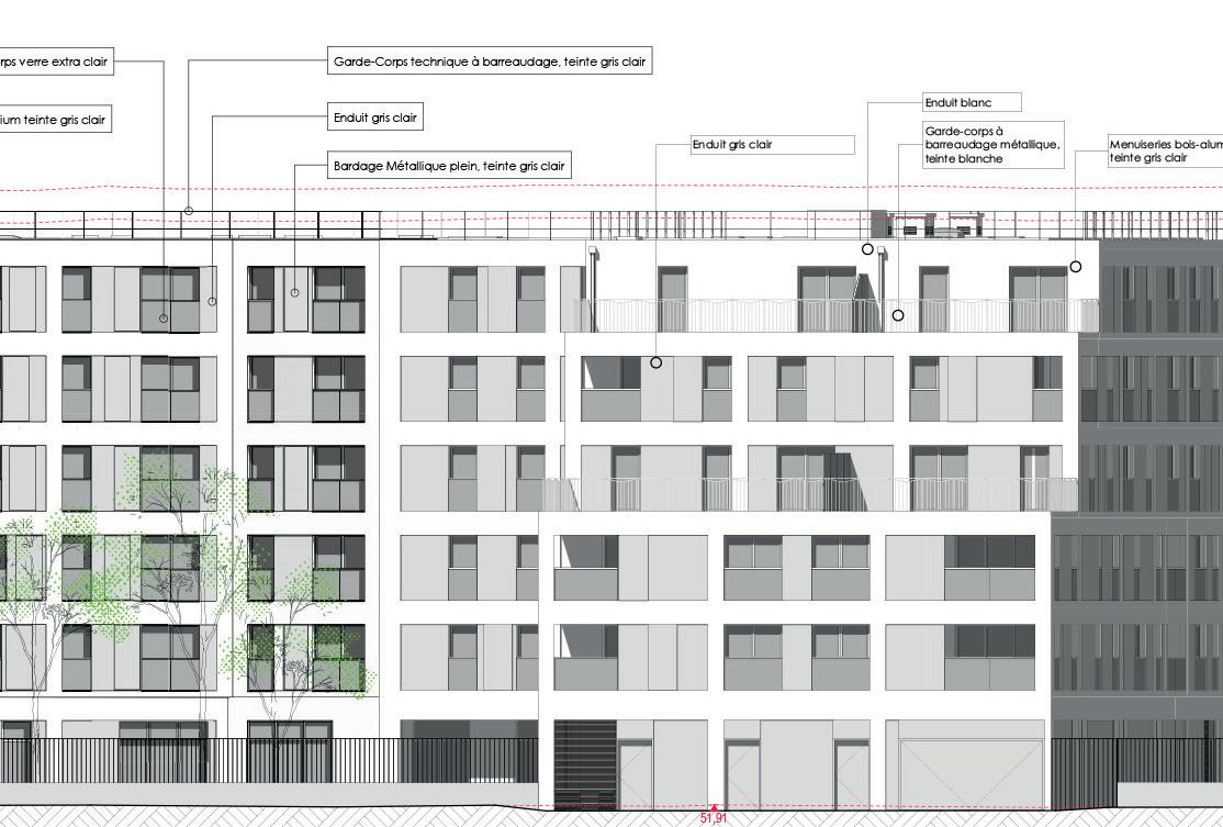 Les logements seront établis sur l’ensemble des niveaux au-dessus du RDC, tandis que les stationnements seront aménagés en totalité sur le RDC et le R-1. Le soubassement ainsi que l’attique sont traités en enduit, dans une teinte sombre sur toute sa surface, y compris le renfoncement de l’accès. Ce traitement se prolonge jusqu’à l’appui des fenêtres du R+1, par un bandeau courant sur tout le bâtiment.