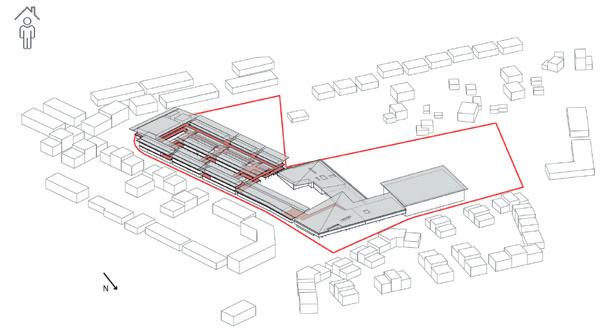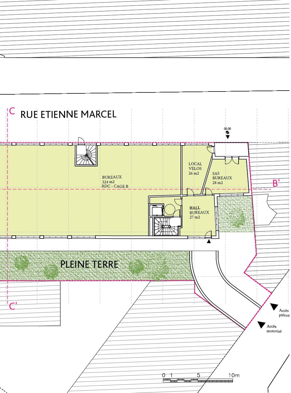 L’attique est encadré par deux bandeaux -un premier le soulignant et un deuxième formant couronnement de l’immeuble rappelant le vocabulaire des immeubles Belle Epoque se trouvant en continuité du terrain du projet. Plan Masse 1/200