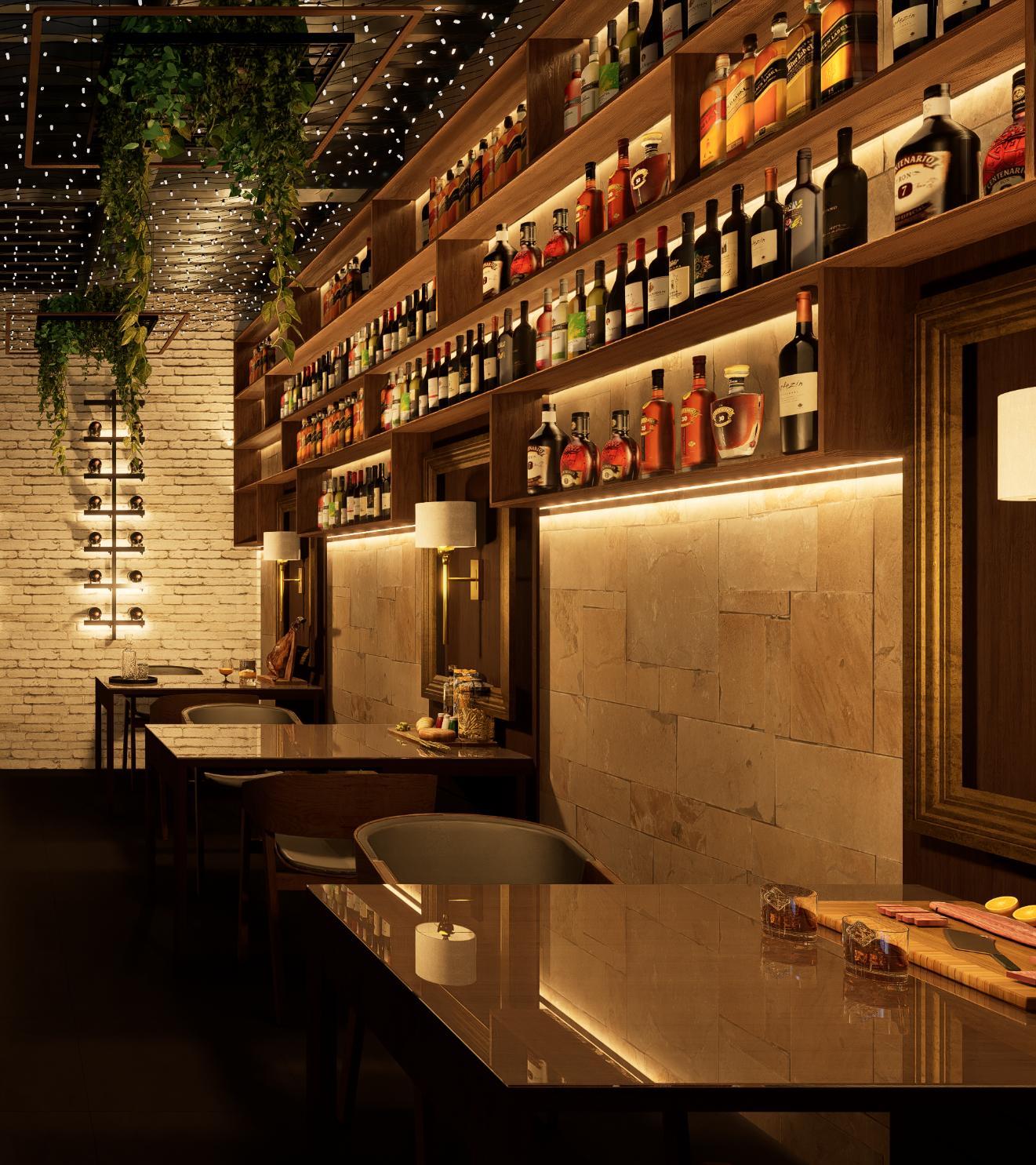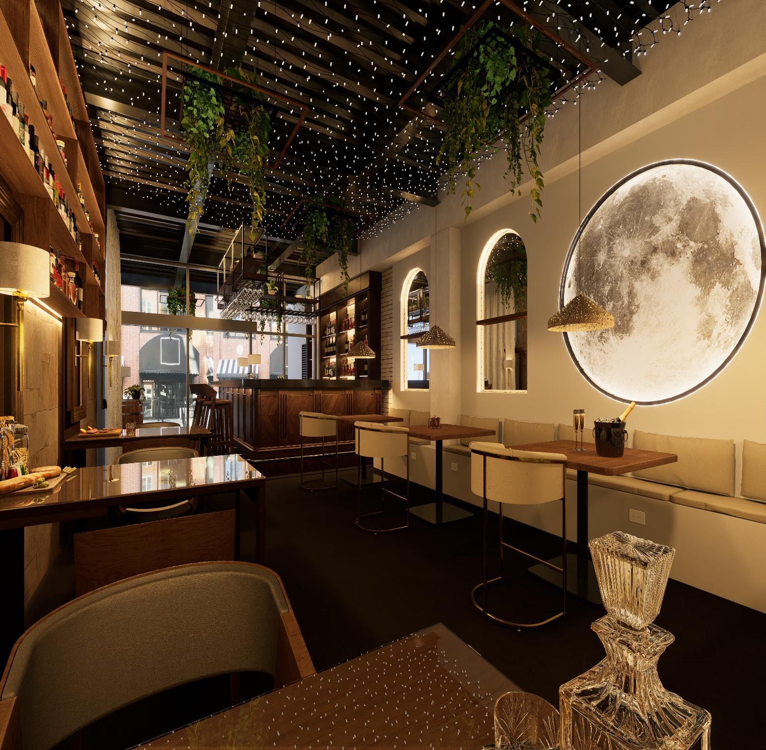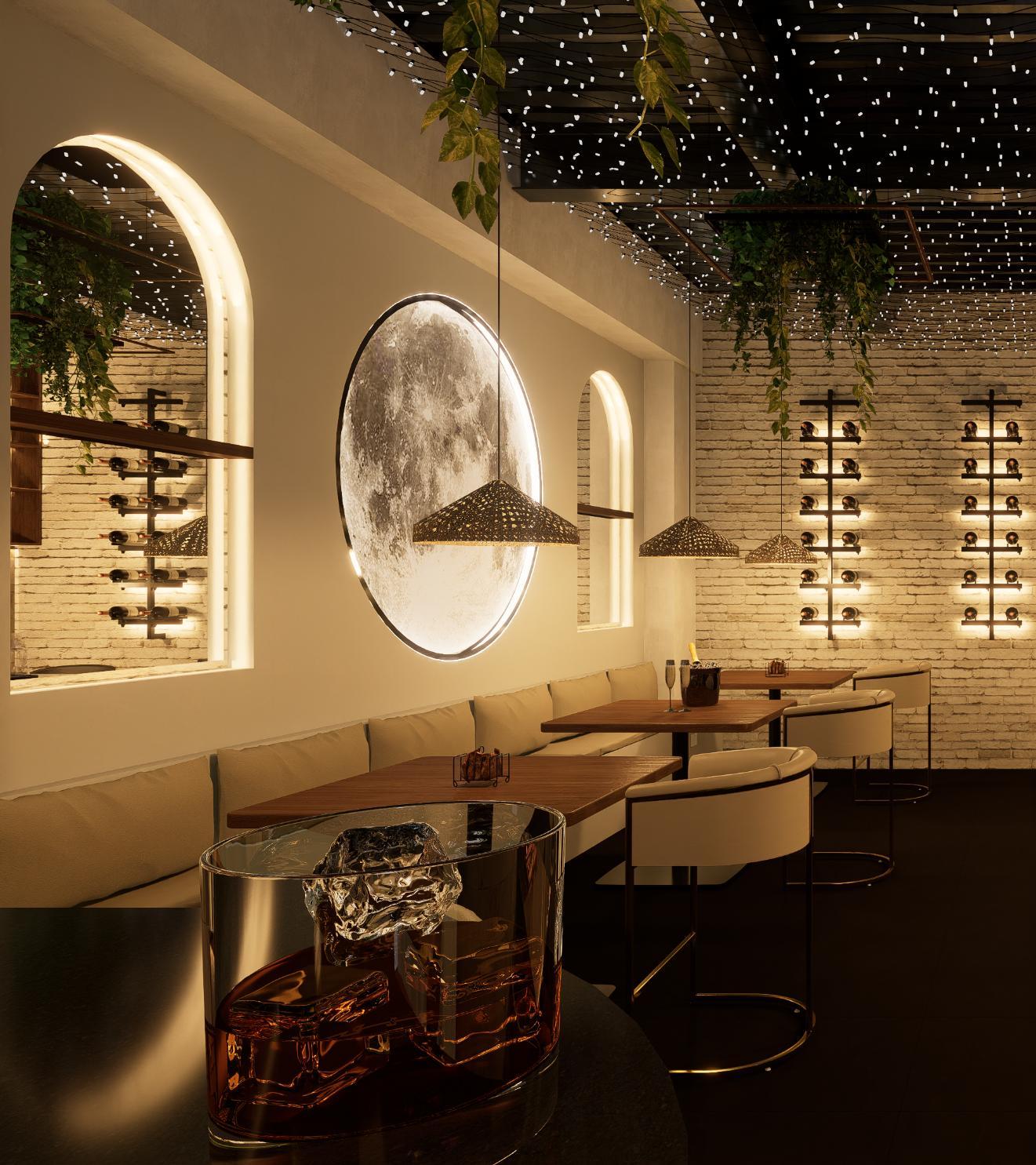 Se llevó a cabo la renovación de un local en una zona comercial de alto tránsito. El concepto arquitectónico combina elementos rústicos, elegantes, modernos e industriales, ideal para una tienda de vinos dirigida a clientes con gusto por sándwiches, vinos, embutidos, tablas de quesos, etc. El objetivo es ofrecer una experiencia inigualable desde la entrada, con una ambientación de noche estrellada simulada, hasta el interior, que se adentra en una atmósfera iluminada por la luna.