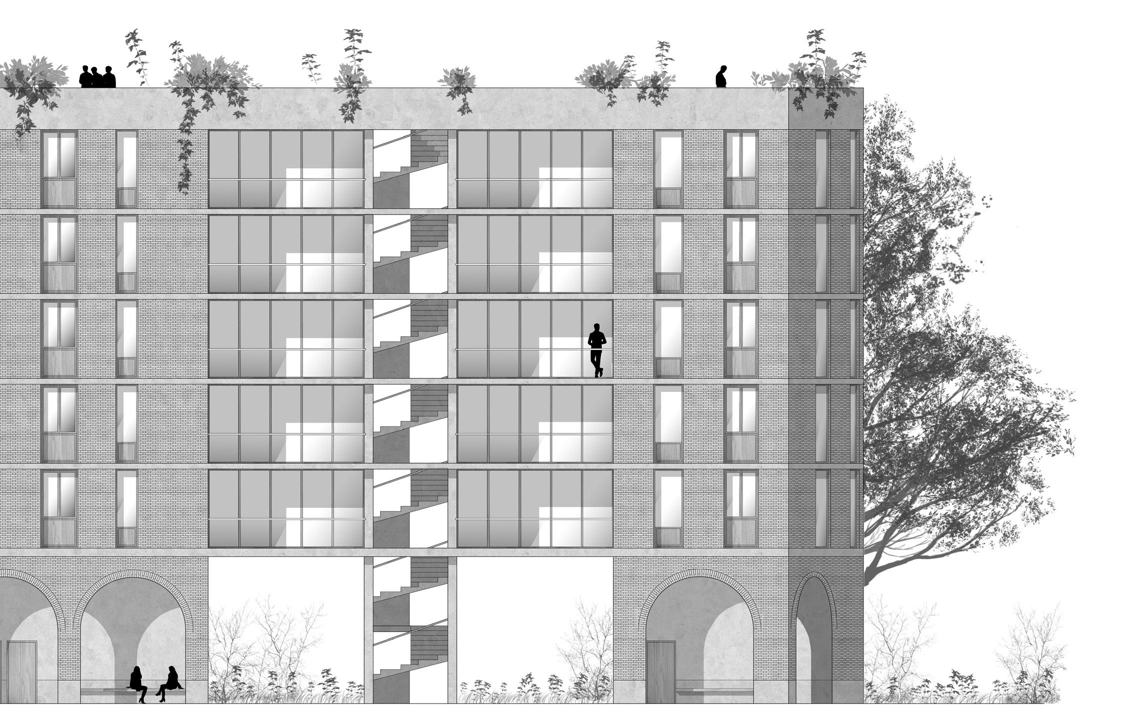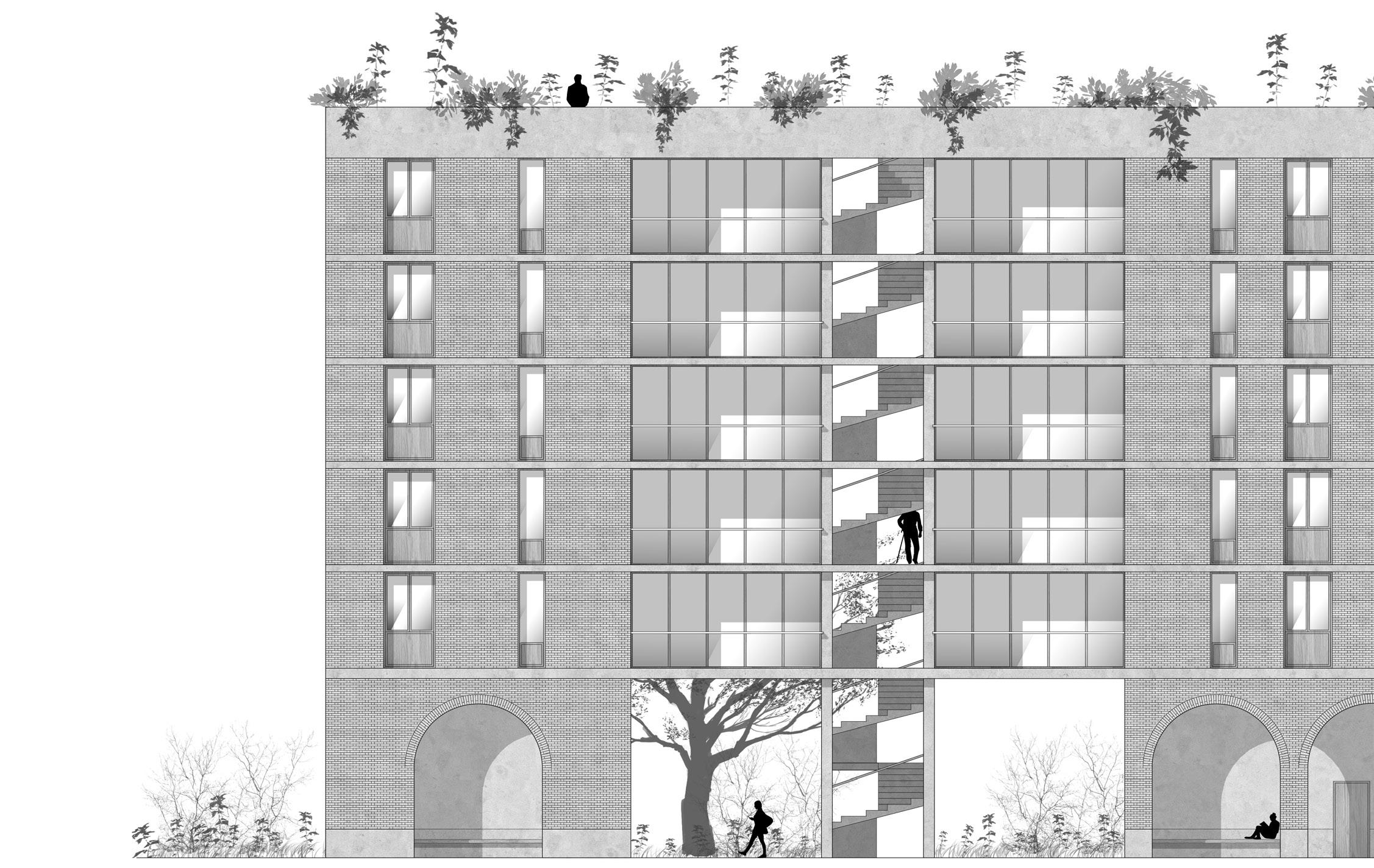 This last situation comes from the hypothesis according to which the road network is less requested thanks to a development of soft mobilites and public transportation networks. It is therefore possible to turn boulevards and avenues into single track roads. The typology is thought to be thin and distance itself from the road by expanding upwards.
