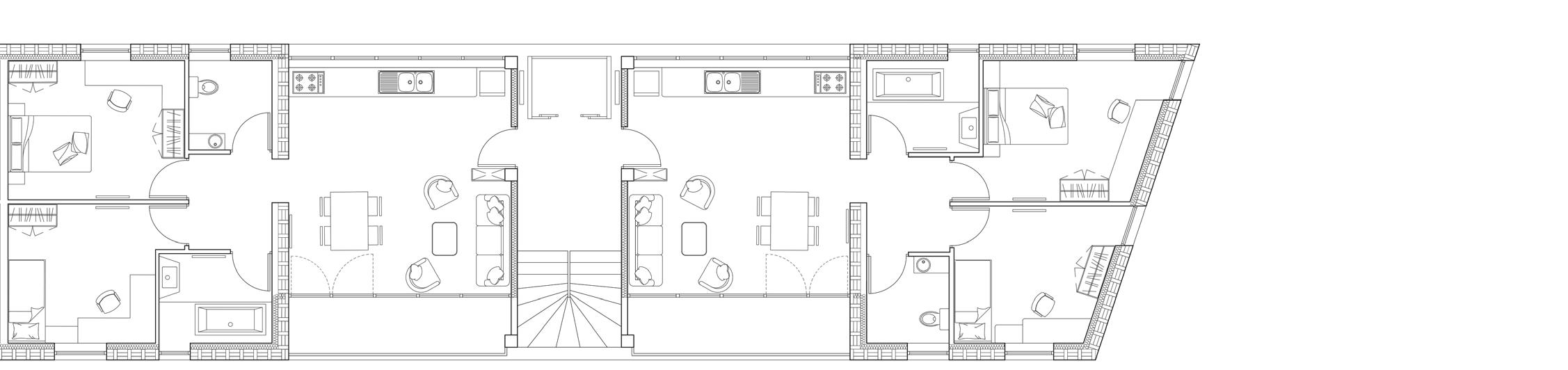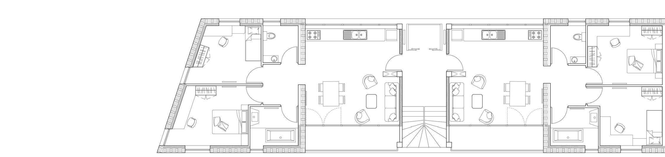 PRM rooms on the first floor, guest rooms on the second and staff rooms on the top floor. The ground floor is dedicated to common spaces, offering a more open plan than the original, encouraging sharing and meeting between different residents and allowing group activities.