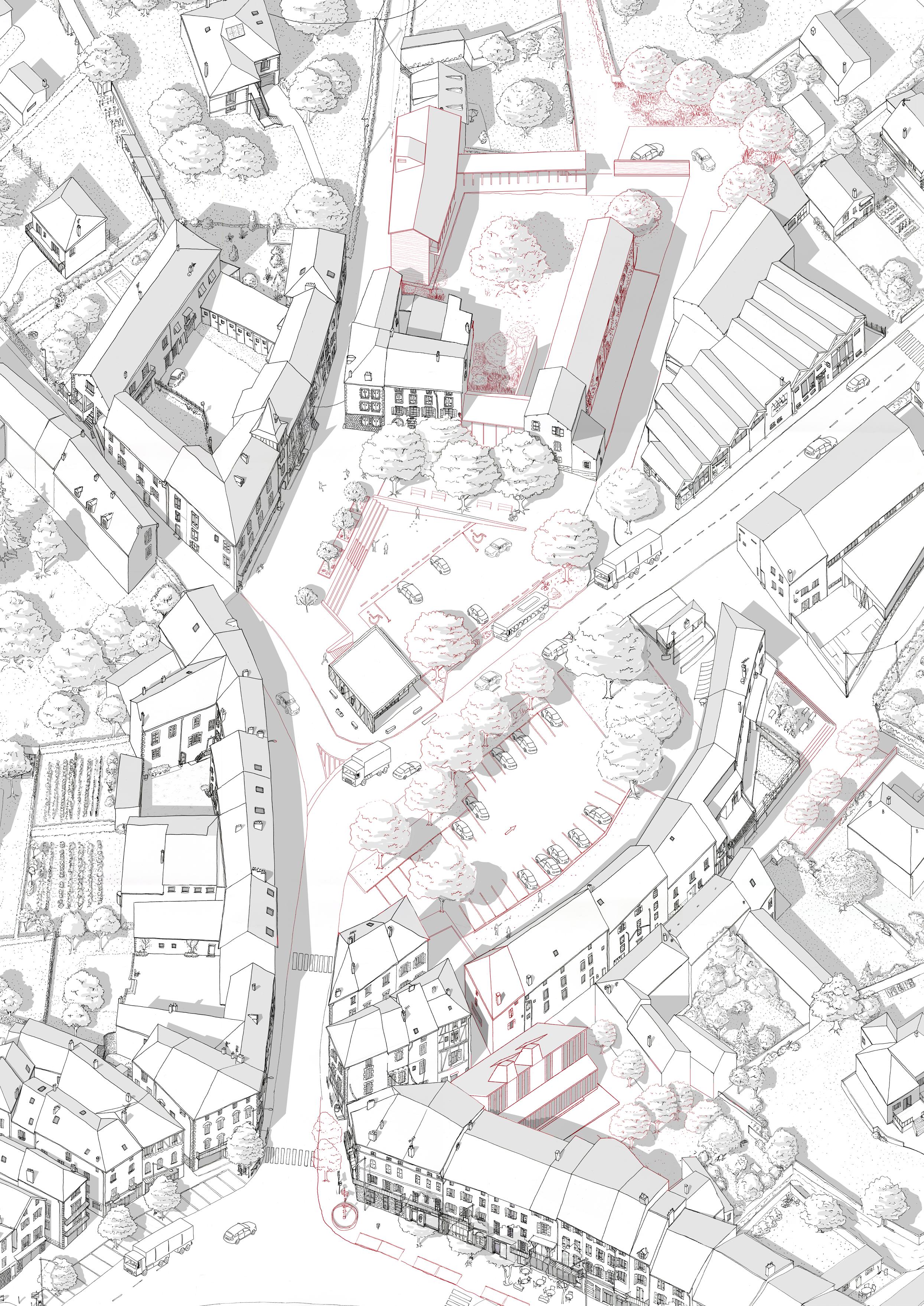 The Place de l’Europe, entrance on the city of Maurs-la-Jolie, used to be an economical hotspot for the region. The transformation of the imperial way into a national road led the former agricultural fairground to turn into a parking lot. Maurs, at the crossway between the Cantal, the Lot and the Aveyron, is a converging point for the food sectors. The proposed programs aim to use those sectors and local suppliers to put in place a culinary fame for the city.