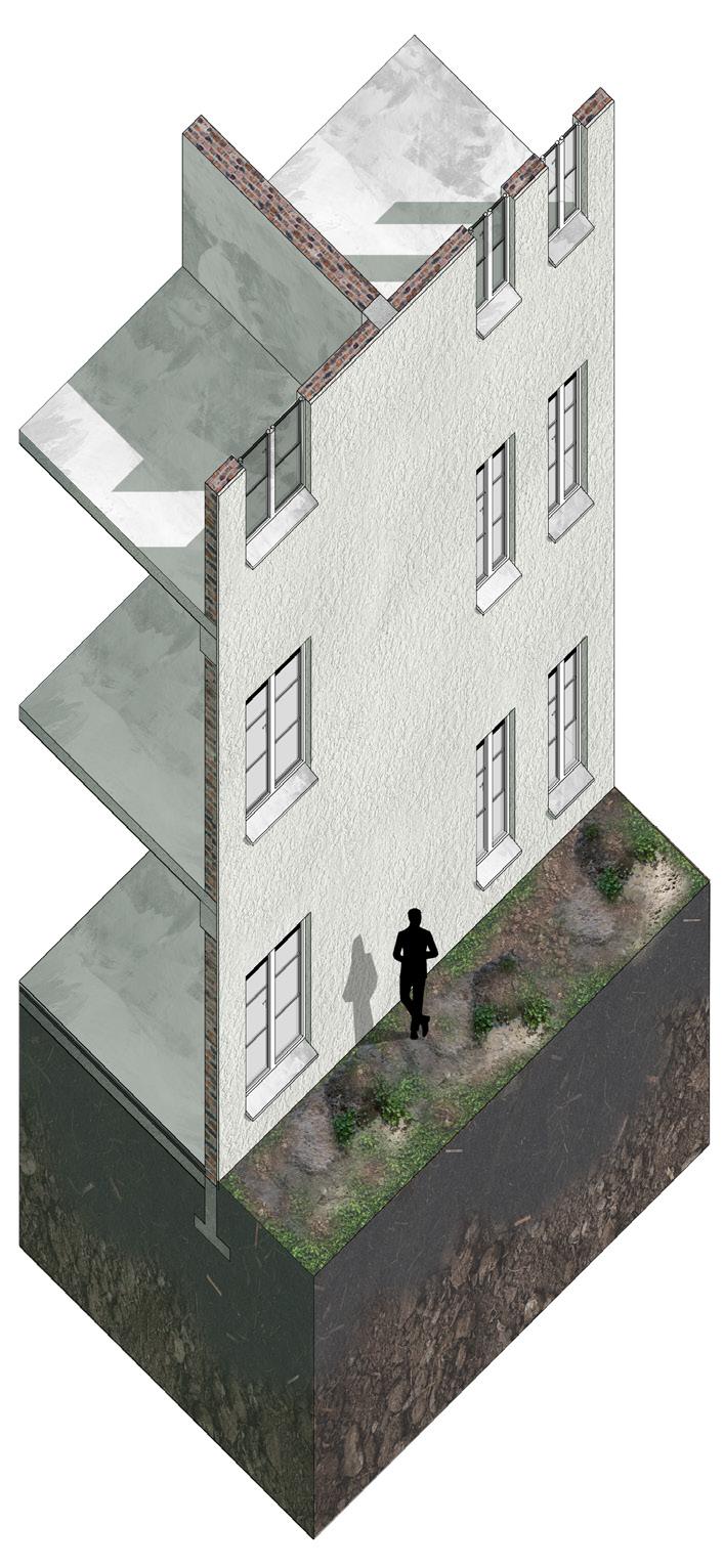 The urbanistic approach aims to introduce third landscapes (concept borrowed from the homonym manifesto by Gilles Clément) in the heart of the city to invert the process of impermeabilization of soils on the surrounding rural spaces. The 5 typologies are, as for them, a proposition of different approaches on densification : the cone, the infill, the individual housing on the riverside, the roof elevation over existing buildings, and the land investment from road infrastructures.