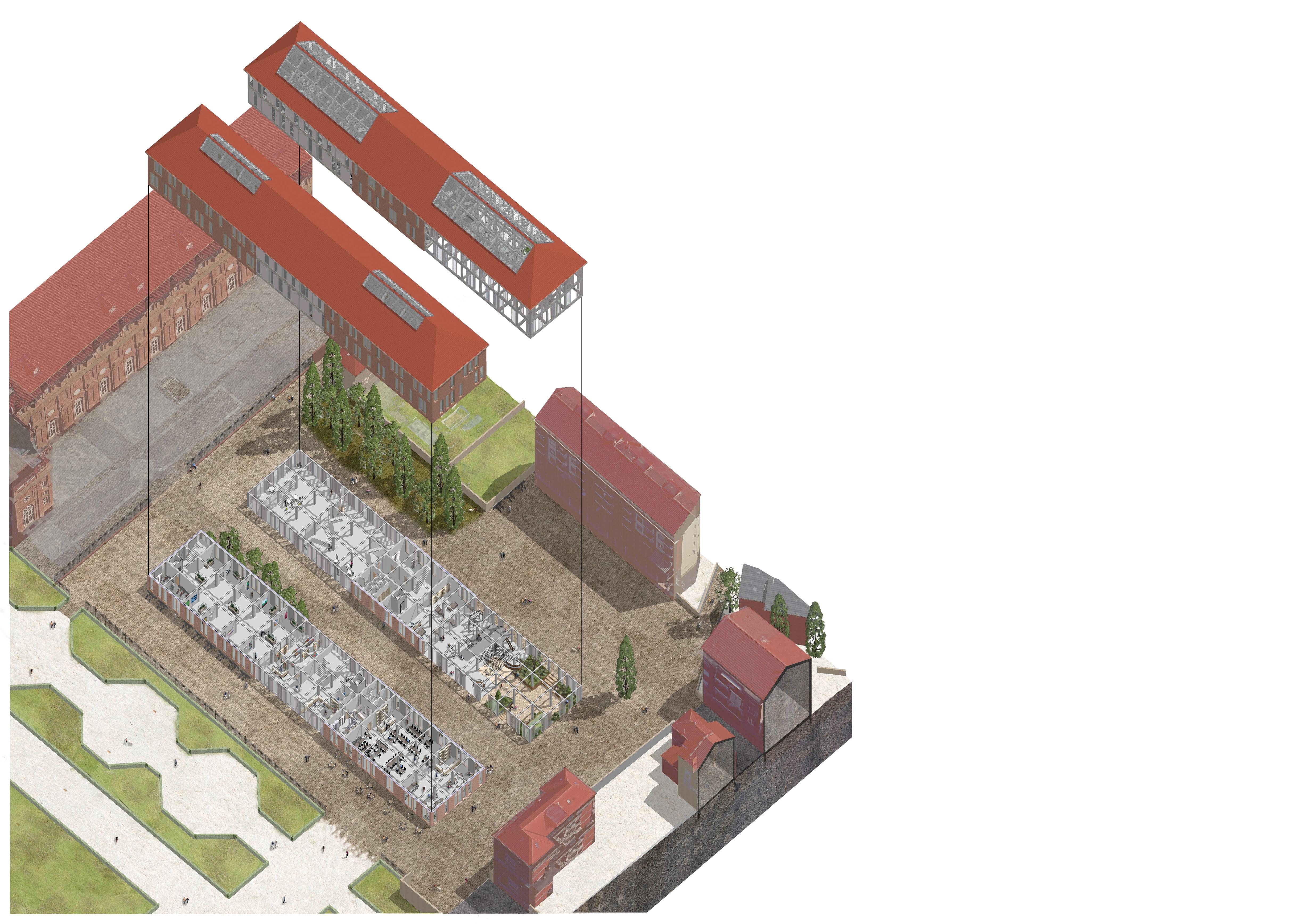 The barracks being in the protected area of Mandria Park, the program must have a beneficial interest for the latter. The program therefore includes, among other things, a greenhouse aimed at preserving protected species, a permanent museum aimed at raising awareness among the local population and tourists about the issues of safeguarding biodiversity, workshop spaces and more.