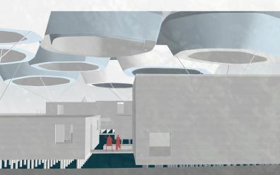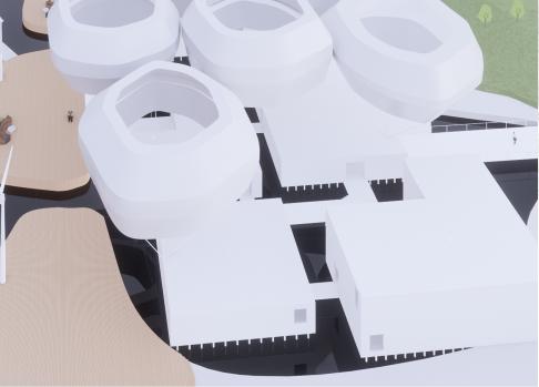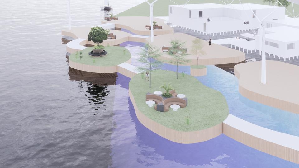 在沿岸改造成海上的浮島,島上主要分為兩種 型態,潮汐發電、⾵⼒發電以及復育計畫,⽽ 能源是僅供教育,因此發電的量有限,在視覺 的尺度上也頗有吸引⼒。其中的兩塊海島主要 為復育⽣態,透過綠化的⽅式增加⽣態的活動