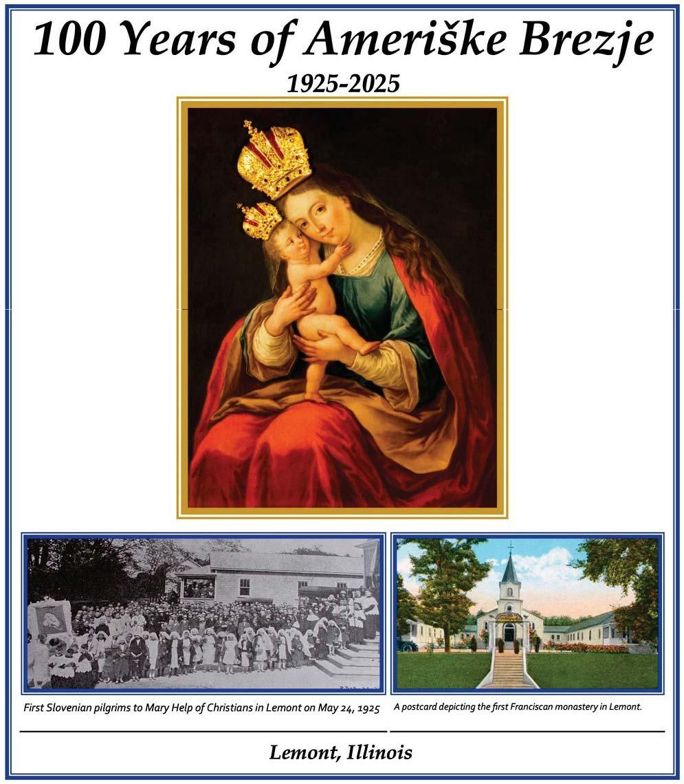 100 Year of Ameriške Brezje Lemont; this property was bought as a farm in 1923. The first Franciscans moved here one year later. In 1925, the first wooden structure, including a monastery and a church, was erected along Main Street and a picture of Marija Pomagaj was placed above the side altar (now on the main altar of the church in the monastery). 100 year anniversary was honored this year on June 1st with rector of the National Shrine of Marija Pomagaj in Brezje, Fr. Robert Bahcic. We will also celebrate this anniversary with the bishop from Ljubljana, Most Reverend Anton Jamnik, on October 19.