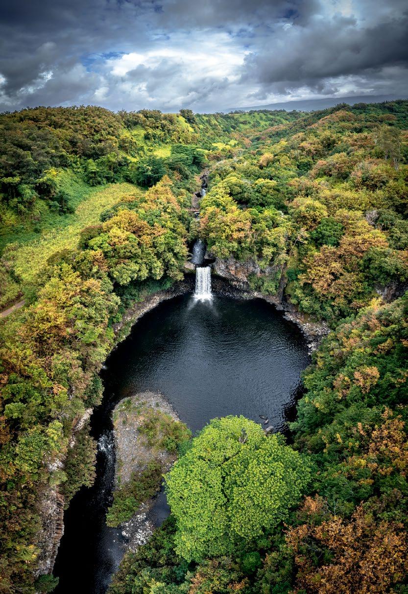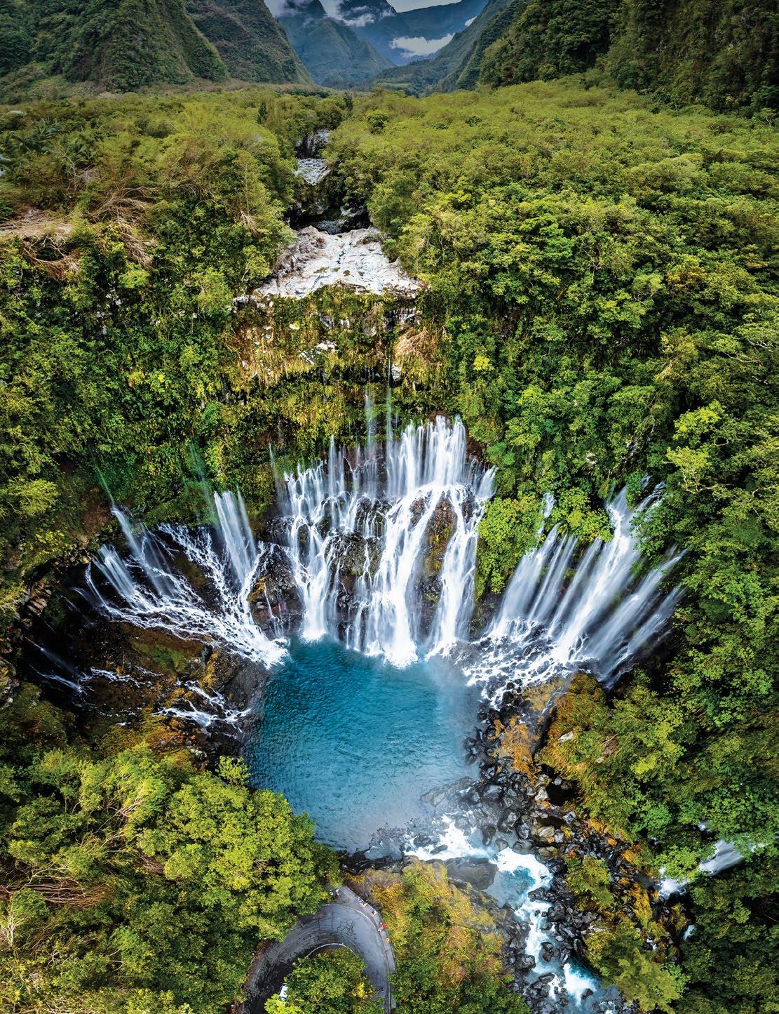 Several streams cascade down a mossy rock face into a turquoise basin at the Langevin Waterfall, also known as Cascade de Grand Galet. On Réunion Island, it captivates with its breathtaking beauty, making it a popular spot for photography, canyoning and even swimming in nearby areas.