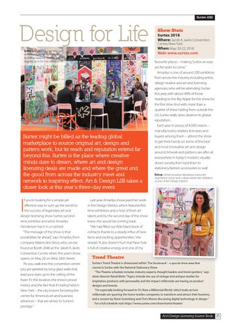 Surtex might be billed as the leading global marketplace to source original art, design and pattern work, but its reach and reputation extend far beyond this. Surtex is the place where creative minds dare to dream, where art and design licensing deals are made and where the great and the good from across the industry meet and network to inspiring effect. Art & Design LSB takes a closer look at this year’s three-day event. f you’re looking for a simple yet effective way to sum up the secret to the success of legendary art and design licensing show Surtex, secondtime exhibitor and artist Amarilys Henderson has it in a nutshell. “The message of the show is that possibilities lie ahead,” says Amarilys, from company Watercolor Devo, who can be found at Booth 2646 at the Jakob K. Javits Convention Centre when this year’s show opens on May 20 on West 34th Street. “As you walk into the convention centre you are greeted by long glass walls that lead your eyes up to the ceiling of the foyer. It’s this location, the show’s proud history and the fact that it’s being held in New York – the city known for being the centre for America’s art and business advances – that are all key to Surtex’s prestige.”