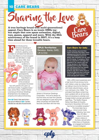 Sharing the Love A true heritage brand with multi-generational appeal, Care Bears is an iconic 1980s toybox staple that now spans animation, digital, toys, games, apparel and more. With the 35th anniversary of the brand in 2017, it’s a busy time ahead for these loveable bears.