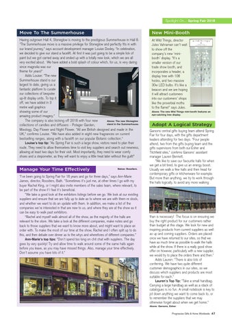 than is necessary! The focus is on ensuring we buy the right product for our customers rather than budget at this stage. We look for new and inspiring products from current suppliers as well as up and coming suppliers. Orders are placed once we have returned to our sites, so that we have as much time as possible to walk the halls while at the show. If there is a really good show offer on however, particularly with a new supplier, we would try to place the orders there and then." Adds Lauren: "There is also lots of conferring. We have two quite different customer demographics in our sites, so we discuss which suppliers and products are most suitable for each." Lauren's Top Tip: "Take a small handbag. Carrying a large handbag as well as a stack of catalogues is no fun. A small notebook is key to jot down anything we want to come back to, or to remember the suppliers that we may otherwise forget about when we get home." Above: Garsons, Esher. Progressive Gifts & Home Worldwide