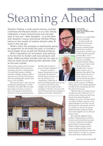 Steaming Ahead Steamer Trading, a multi-award winning, multiple cookshop and lifestyle retailer, is on a roll, having undergone a major restructuring over the past year. A new ceo - Mark Saunders - is at the helm, with Steamer's owner and former MD Ben Philips taking on the mantle of creative director after 16 years in the top job. What's more, the company is significantly going for expansion on all fronts this year, to include a much bigger focus on gift-led lifestyle products. With a reputation for innovation, and wanting to be the first to market with new products and ideas, PG&H put Mark and Ben into the hot seat to find out what will be defining their giftware offer as the year unfolds. Taking over the company's reins from award winning Ben Philips would be daunting for most people. But with an outstanding retail CV himself, Mark Saunders is definitely relishing the challenge, bringing a wealth of experience and a fresh eye to the business which was founded by Ben's parents, David and Liz, in the mid 1980's. With almost 30 years in retail, spent with international household brands, to include Cath Kidston and Habitat, Mark has clearly got his finger on the pulse, concurring: "I have a lot of experience with brands and family firms, as well as growing businesses