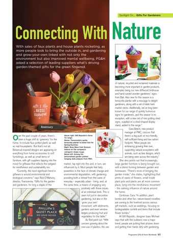 Connecting With Nature With sales of faux plants and house plants rocketing, as more people look to bring the outside in, and gardening and grow-your-own linked with not only the environment but also improved mental wellbeing, PG&H asked a selection of leading suppliers what’s driving garden-themed gifts for the green fingered.