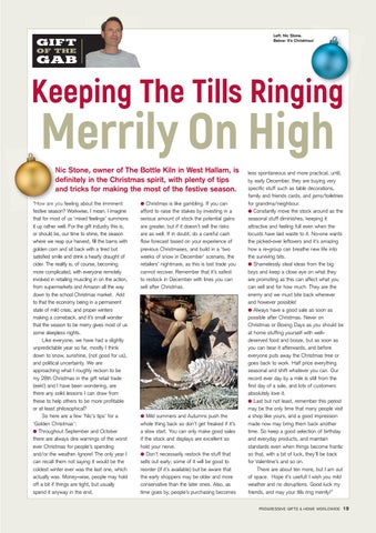 “How are you feeling about the imminent festive season? Workwise, I mean. I imagine that for most of us ‘mixed feelings’ summons it up rather well. For the gift industry this is, or should be, our time to shine, the season where we reap our harvest, fill the barns with golden corn and sit back with a tired but satisfied smile and drink a hearty draught of cider. The reality is, of course, becoming more complicated, with everyone remotely involved in retailing muscling in on the action, from supermarkets and Amazon all the way down to the school Christmas market. Add to that the economy being in a permanent state of mild crisis, and proper winters making a comeback, and it’s small wonder that the season to be merry gives most of us some sleepless nights. Like everyone, we have had a slightly unpredictable year so far, mostly I think down to snow, sunshine, (not good for us), and political uncertainty. We are approaching what I roughly reckon to be my 28th Christmas in the gift retail trade (eek!) and I have been wondering, are there any solid lessons I can draw from these to help others to be more profitable or at least philosophical? So here are a few ‘Nic’s tips’ for a ‘Golden Christmas’: l Throughout September and October there are always dire warnings of the worst ever Christmas for people’s spending and/or the weather. Ignore! The only year I can recall them not saying it would be the coldest winter ever was the last one, which actually was. Money-wise, people may hold off a bit if things are tight, but usually spend it anyway in the end.