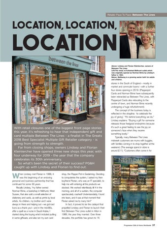 stores in the South of England - mostly in market and commuter towns - with a further four stores opening in 2019. (Pepperpot Cards and Norman Brine have subsequently been rebranded as Between The Lines, with Pepperpot Cards also relocating to the centre of town, and Norman Brine recently undergoing a huge refurbishment). The concept of the business today is reflected in the strapline: ‘to celebrate the joy of giving’. “It’s behind everything we do,” Lindsey explains. “Buying a gift for someone releases those feelgood endorphins because it’s such a great feeling to see the joy on someone’s face when they receive something lovely.” Typically, many Between The Lines midweek customers are mums with buggies, with families coming in to shop together at the weekend. (The average spend in store is around £11). “Customers often come in for