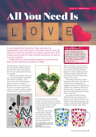 TOP DISPLAY TIP l “Look at a promotion around couples, inviting messages to be posted online or in store, with a prize for the best one. Or fill the window with message of love and sentiment.” Julian Hunt, managing director, Lesser & Pavey