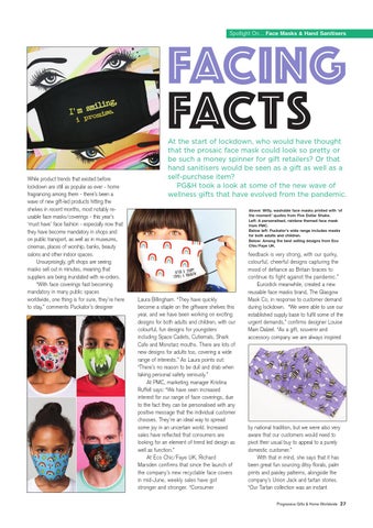Laura Billingham. “They have quickly become a staple on the giftware shelves this year, and we have been working on exciting designs for both adults and children, with our colourful, fun designs for youngsters including Space Cadets, Cutiemals, Shark Cafe and Monstarz mouths. There are lots of new designs for adults too, covering a wide range of interests.” As Laura points out: “There’s no reason to be dull and drab when taking personal safety seriously.” At PMC, marketing manager Kristina Ruffell says: “We have seen increased interest for our range of face coverings, due to the fact they can be personalised with any positive message that the individual customer chooses. They’re an ideal way to spread some joy in an uncertain world. Increased sales have reflected that consumers are looking for an element of trend led design as well as function.” At Eco Chic/Faye UK, Richard Marsden confirms that since the launch of the company’s new recyclable face covers in mid-June, weekly sales have got stronger and stronger. “Consumer