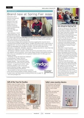 Spring Fair’s Hall 9 (Kitchen & Dining) will embrace a wide spectrum from craft products in the new Artisan Avenue to leading housewares names including Denby, Ulster Weavers, Grunwerg, T&G and Le Creuset. New exhibitors in Hall 9 include Kiddi Kutter, with specialist knives designed for children aged three years and older to cut their own food safely, enabling parents to teach kids cooking for an early age. Western International, Muggi (with its cupholder tray) and JO Group are also joining the Hall. A new brand, Smidge will be revealed at the show, targeting the consumer who is choosing environmentally friendlier options. Smidge’s 90 products cover a wide variety of categories from ‘on the go’ through to everyday household usage and include a unique 100% bio-degradable and recyclable formulation. The new brand states that its philosophy is ‘responsible, affordable, optimistic’, enabling consumers to ‘make that small change which together can make a big difference’. Specialising in hydration solutions, Auteur will launch its new brand, Soma, as well as new additions across its portfolio. Soma creates elegant filtration and hydration products, with a focus on sustainability from the sugarcane material used in its filter jugs to its bamboo handles. Portmeirion Group will reveal new collections including Botanic Garden Harmony (Portmeirion), Atrium (Portmeirion) and Kingsley (Spode). “They have been heavily influenced by the current trend to bring the outside in - a huge trend for 2019 - while remaining steeped in each of the three brand’s individual heritage,” explained sales and marketing director Phil Atherton. Demonstrations at Spring Fair include Tramontina, Above: The logo for a new brand, Smidge which will be serving samples of steaks, expertly cut with launches at Spring its steak knives. See linked stories (including KitchenCraft on page 13) which Fair. Visit www.springfair.com
