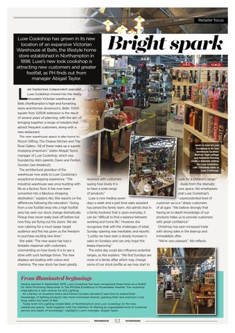 ast September, independent specialist Luxe Cookshop moved into the newly renovated Victorian warehouse at Bells (Northampton’s high end furnishing store and kitchen showroom). Bells’ 7,000 square foot, £250K extension is the result of several years of planning, with the aim of bringing together a range of retailers that attract frequent customers, along with a new restaurant. The new warehouse space is also home to Mooch Gifting, The Cheese Kitchen and The Rose Gallery. “All of these make up a superb shopping emporium,” states Abigail Taylor, manager of Luxe Cookshop, which was founded by Abi’s parents, Dawn and Fenton Goodes (see breakout). The architectural grandeur of the warehouse now adds to Luxe Cookshop’s exceptional shopping experience. “The industrial warehouse was once bustling with life as a factory floor; it has now been converted into a fabulous shopping destination,” explains Abi. She reports on the differences following the relocation: “Going from a low footfall shop into a high footfall area has seen our stock change dramatically. Pickup lines never really took off before but now they are flying out the doors. We are now catering for a much larger target audience and this has given us the freedom to purchase exciting new lines.” She adds: “The new space has had a fantastic response with customers commenting on how lovely it is to see a store with such heritage thrive. The new displays are busting with colour and charisma. The new stock has been greatly