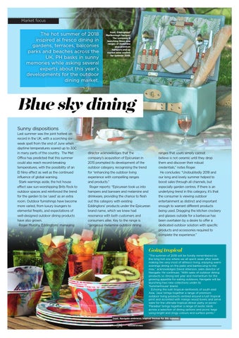 ranges that users simply cannot believe is not ceramic until they drop them and discover their robust credentials,” notes Roger. He concludes: “Undoubtedly 2018 and our long and lovely summer helped to boost sales through all channels, but especially garden centres. If there is an underlying trend in this category, it's that the consumer is viewing outdoor entertainment as distinct and important enough to warrant different products being used. Dragging the kitchen crockery and glasses outside for a barbecue has been overtaken by a desire to offer a dedicated outdoor solution with specific products and accessories required to complete the experience.”