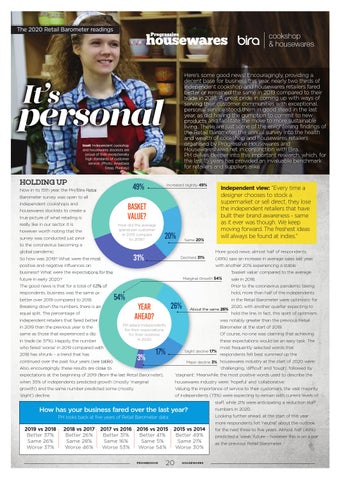 More good news: almost half of respondents (49%) saw an increase in average sales last year, with another 20% experiencing a stable ‘basket value’ compared to the average Marginal Growth 54% sale in 2018. Prior to the coronavirus pandemic taking hold, more than half of the independents in the Retail Barometer were optimistic for 2020, with another quarter expecting to About the same 26% hold the line. In fact, this spirit of optimism was notably greater than the previous Retail Barometer at the start of 2019. Of course, no-one was claiming that achieving these expectations would be an easy task. The most frequently selected words that Slight decline 17% respondents felt best summed up the Major decline 3% housewares industry at the start of 2020 were: ‘challenging, ‘difficult’ and ‘tough’, followed by ‘stagnant’. Meanwhile, the most positive words used to describe the housewares industry were: ‘hopeful’ and ‘collaborative.’ Valuing the importance of service to their customers, the vast majority of independents (73%) were expecting to remain with current levels of staff, while 21% were anticipating a reduction staff numbers in 2020. How has your business fared over the last year? Looking further ahead, at the start of this year PH looks back at five years of Retail Barometer data: more respondents felt ‘neutral’ about the outlook 2019 vs 2018 2018 vs 2017 2017 vs 2016 2016 vs 2015 2015 vs 2014 for the next three to five years. Almost half (49%) Better 37% Better 26% Better 31% Better 41% Better 49% predicted a ‘weak’ future – however this is on a par Same 26% Same 28% Same 16% Same 5% Same 21% as the previous Retail Barometer.