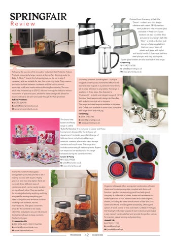 range is called ‘Butterfly Meadow’. It is exclusive to Lesser and Pavey having been designed by the in-house art department. It includes a wonderful range of tabletop items, including quality mugs, ceramics, coasters, placemats, trays, storage canisters and much more. The range also includes some new gift stationary items. Buyers can expect to see additions to this range released during the summer months. Lesser & Pavey T: 01322 279225 E: sales@leonardo.co.uk W: www.leonardo.co.uk Tramontina’s new Purezza glass storageware (pictured) proved to be a roaring success with buyers. Highly practical and also very stylish, there are currently three different sizes of Organics tableware offers an inspired combination of rustic
