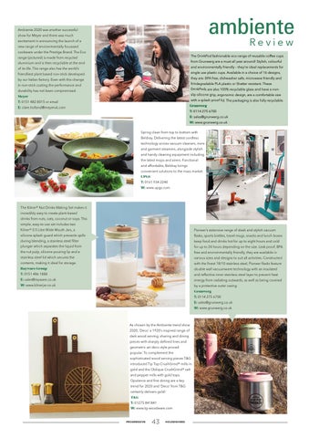 As chosen by the Ambiente trend show 2020, ‘Deco’ a 1920’s inspired range of dark wood serving, sharing and dining pieces with sharply defined lines and geometric art deco style proved popular. To complement the sophisticated wood serving pieces T&G introduced Tip Top CrushGrind® mills in gold and the Oblique CrushGrind® salt and pepper mills with gold tops. Opulence and fine dining are a key trend for 2020 and ‘Deco’ from T&G certainly delivers gold! T&G T: 01275 841841 W: www.tg-woodware.com